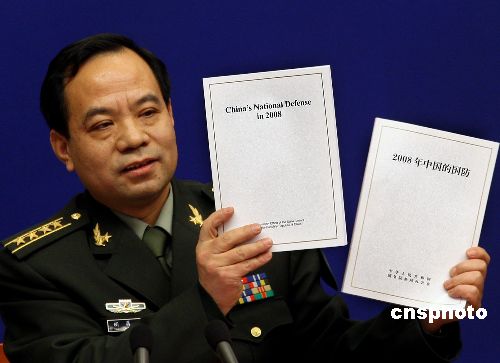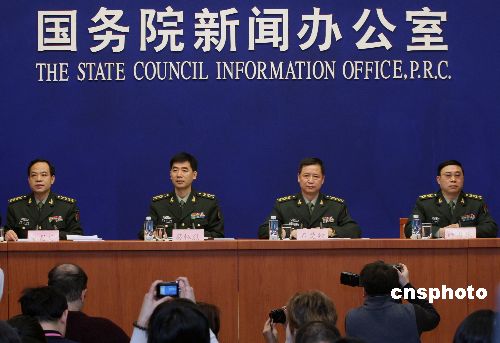 1月20日上午,國(guó)務(wù)院新聞辦公室在北京舉行發(fā)表《2008年中國(guó)的國(guó)防》白皮書新聞發(fā)布會(huì),國(guó)防部新聞事務(wù)局局長(zhǎng)、國(guó)防部新聞發(fā)言人胡昌明大校做主題發(fā)言,解放軍總參、總政、總后、總裝各部相關(guān)人士到會(huì)回答記者提問(wèn)。中新社發(fā) 宋吉河 攝