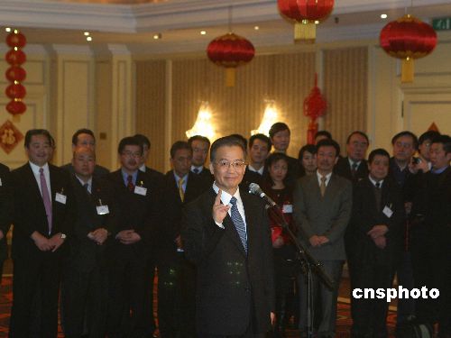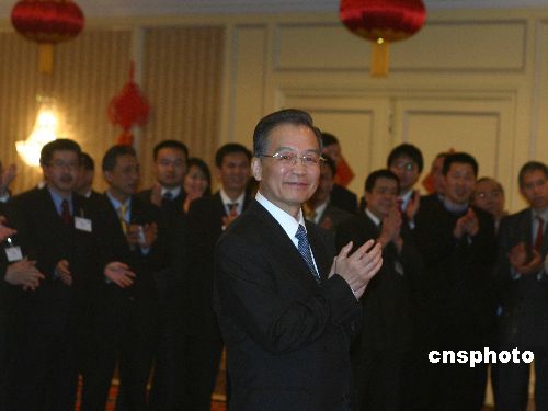 當(dāng)?shù)貢r(shí)間一月二十九日晚,中國(guó)總理溫家寶在結(jié)束對(duì)德國(guó)的訪問(wèn)后飛抵布魯塞爾,并首先看望了中國(guó)駐歐盟的外交官們和當(dāng)?shù)厝A僑華人代表。會(huì)見(jiàn)現(xiàn)場(chǎng)被布置得充滿節(jié)日的喜慶氣氛。溫家寶笑言這次出訪被稱為“急行軍”,自己的時(shí)差也有點(diǎn)沒(méi)倒好。中新社發(fā) 張朔 攝