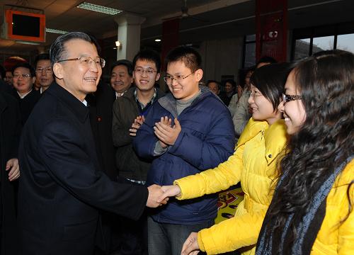 2月15日晚,正在天津調(diào)查研究的中共中央政治局常委、國務(wù)院總理溫家寶來到南開大學(xué)親切看望大學(xué)生。他勉勵同學(xué)們要心系國家,努力學(xué)習(xí),甘于奉獻,樹立正確的擇業(yè)觀念。 新華社記者 李學(xué)仁 攝