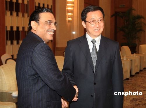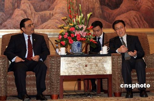 2月23日晚,上海市市長(zhǎng)韓正在上海虹橋迎賓館會(huì)見(jiàn)巴基斯坦總統(tǒng)扎爾達(dá)里,韓正熱情邀請(qǐng)巴基斯坦總統(tǒng)參觀2010年上海世博會(huì)。中新社發(fā) 潘索菲 攝