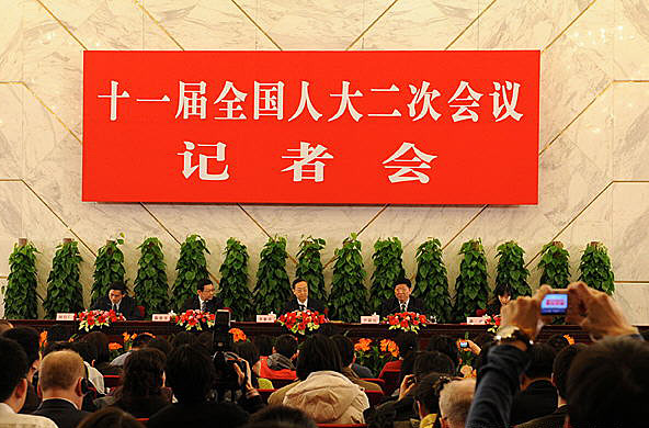 3月10日,十一屆全國人大二次會(huì)議舉行記者會(huì),工業(yè)和信息化部部長李毅中、人力資源和社會(huì)保障部部長尹蔚民、商務(wù)部部長陳德銘答記者問。陳樹根 攝