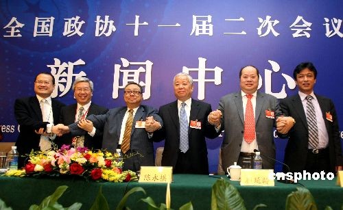 3月10日,全國(guó)政協(xié)十一屆二次會(huì)議舉行“港澳委員談如何應(yīng)對(duì)全球金融危機(jī)”專(zhuān)題記者會(huì),陳永棋、李家祥、張華鋒、蔡冠深、許健康、顏延齡委員回答記者提問(wèn)。記者會(huì)結(jié)束后,六位港澳委員手拉手,表示共同對(duì)抗金融危機(jī)。中新社發(fā) 傅丹丹 攝