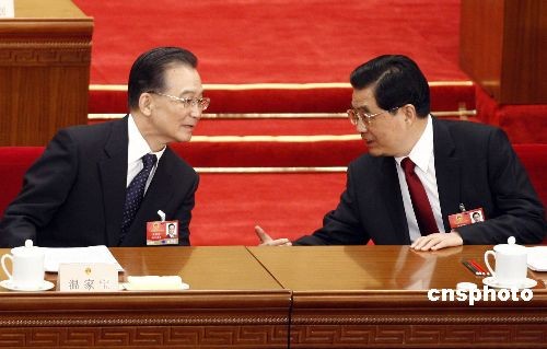 3月10日,十一屆全國人大二次會議舉行第三次全體會議,最高人民法院院長王勝俊、最高人民檢察院檢察長曹建明分別作工作報告。圖為國家主席胡錦濤與國務院總理溫家寶在會議開始前交談。中新社發(fā) 盛佳鵬 攝