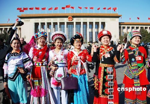 3月13日,一群少數民族全國人大代表參加“兩會”閉幕會后揮手告別,相約明年“兩會”再見。中新社發(fā) 韓海冰 攝