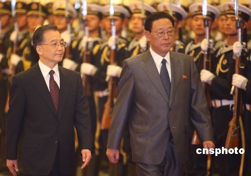 3月18日下午,中國總理溫家寶在北京人民大會堂舉行儀式,歡迎朝鮮民主主義人民共和國內(nèi)閣總理金英日訪華。中新社發(fā) 任晨鳴 攝