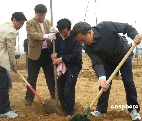 2009年3月21日,河北省及石家莊市黨政軍領(lǐng)導(dǎo)及省市四大辦公機(jī)關(guān)干部、部隊(duì)官兵1900人,在石家莊市鹿泉市山前大道韓莊生態(tài)林業(yè)基地,建設(shè)“省級(jí)領(lǐng)導(dǎo)紀(jì)念林”、“市級(jí)領(lǐng)導(dǎo)紀(jì)念林”、“駐石部隊(duì)紀(jì)念林”100多畝,栽植速生楊樹12000株,再一次掀起了省會(huì)造林綠化高潮。中新社發(fā) 俱凝搏 攝