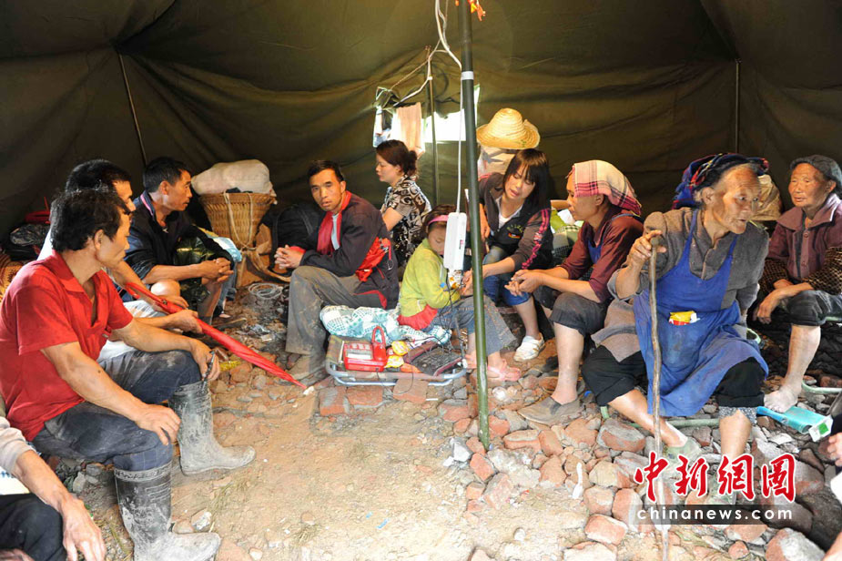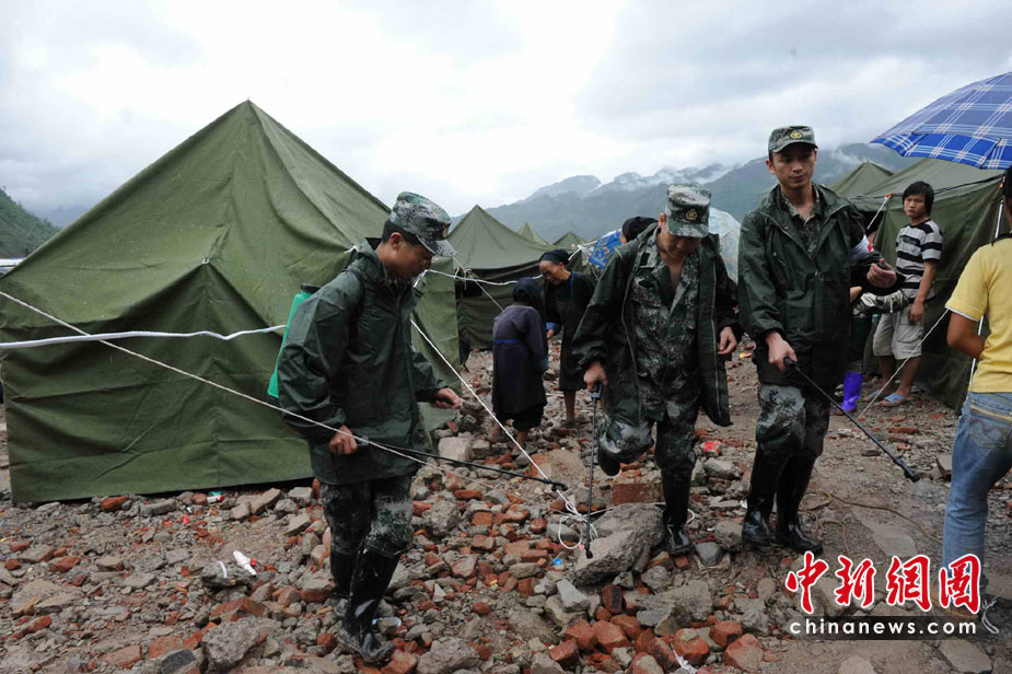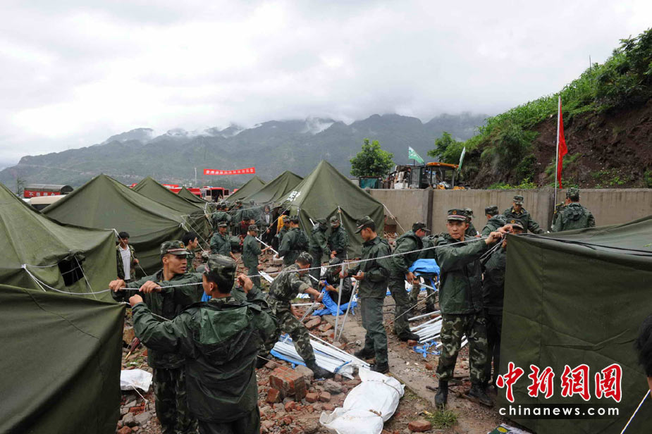 29日下午,在貴州關(guān)嶺滑坡災(zāi)害受災(zāi)群眾安置點(diǎn),救援部隊(duì)為受災(zāi)群眾搭建帳篷,并進(jìn)行消毒防疫。曹多然 攝