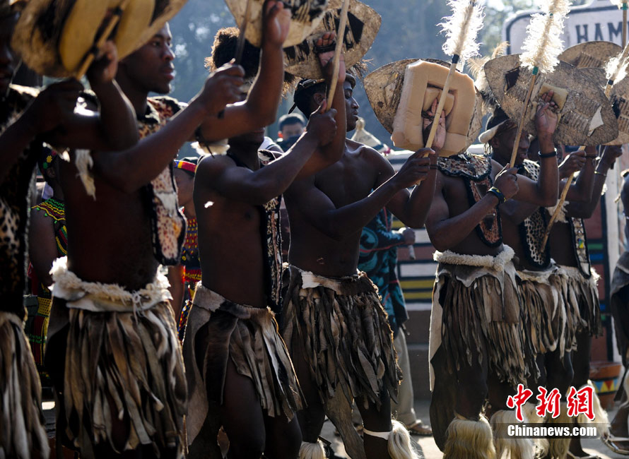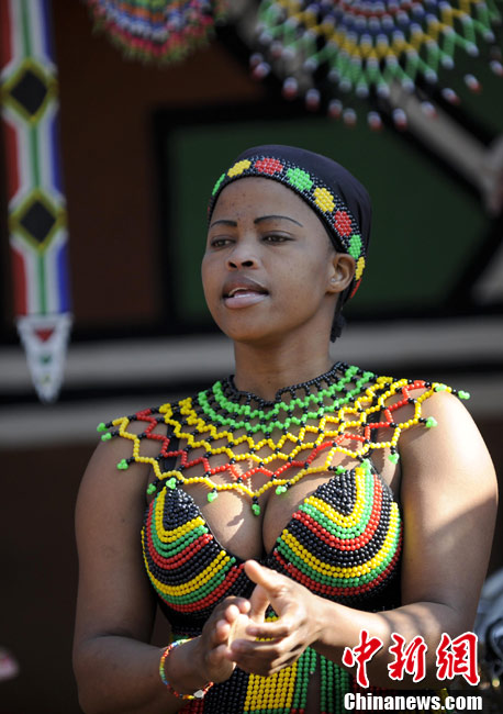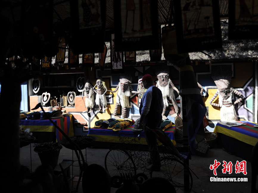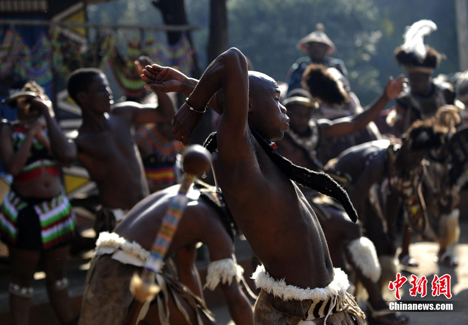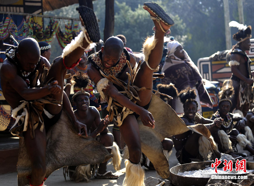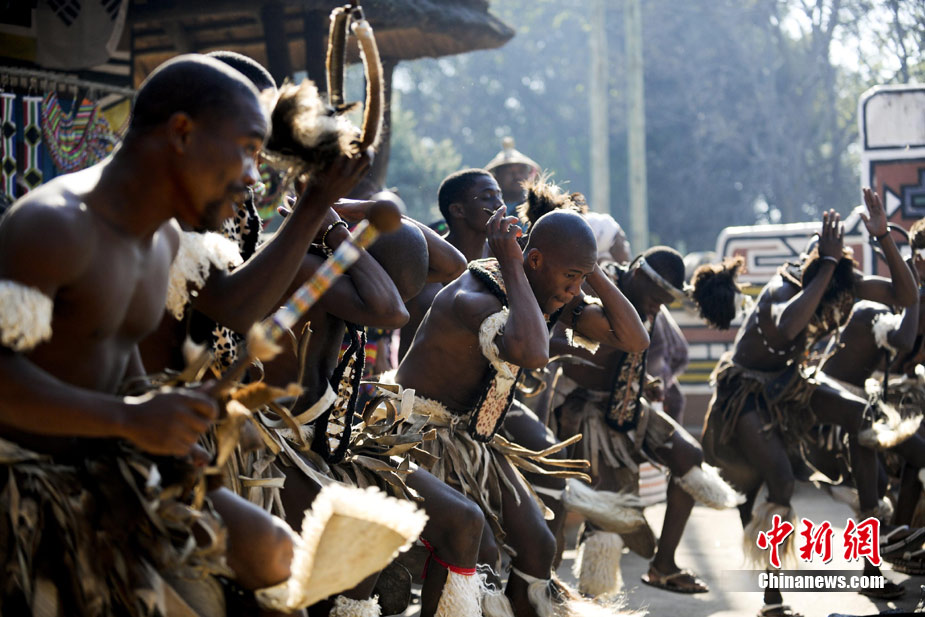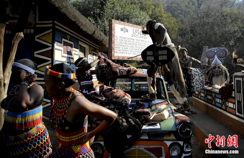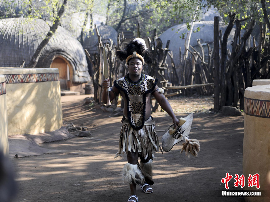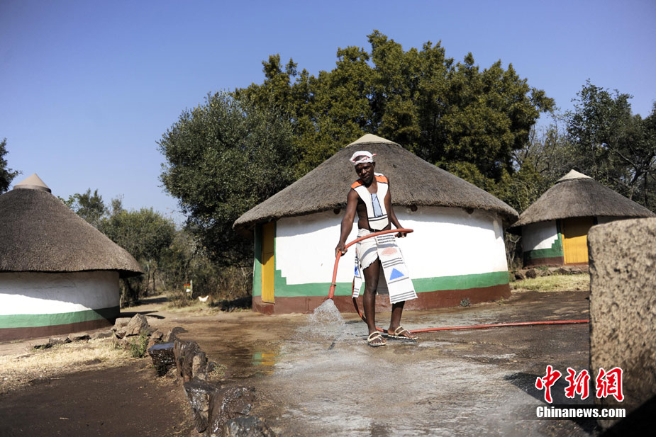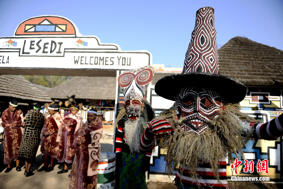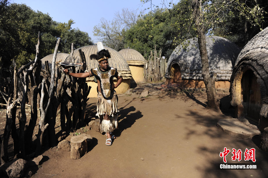 在南非約堡郊外,號稱“南非文化窗口”的萊賽迪(Lesedi)民俗村,聚居著南非最重要的四個部落。這里有著非洲土著餐飲,還有著原生態(tài)的舞蹈表演,當客人來訪,村民就會盛裝在村口迎接。圖為萊賽迪民俗村。 中新社記者 廖攀攝