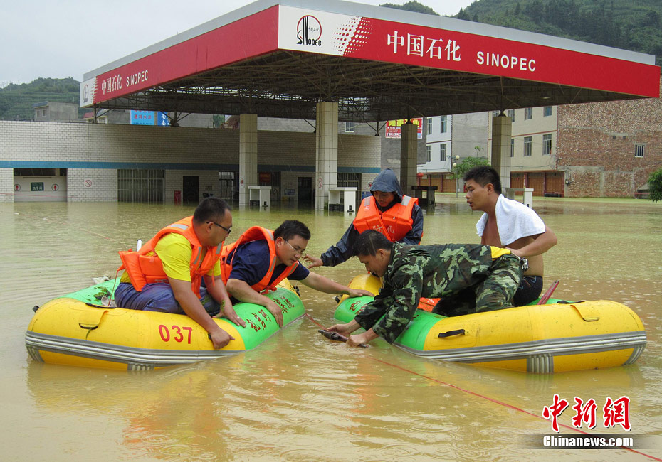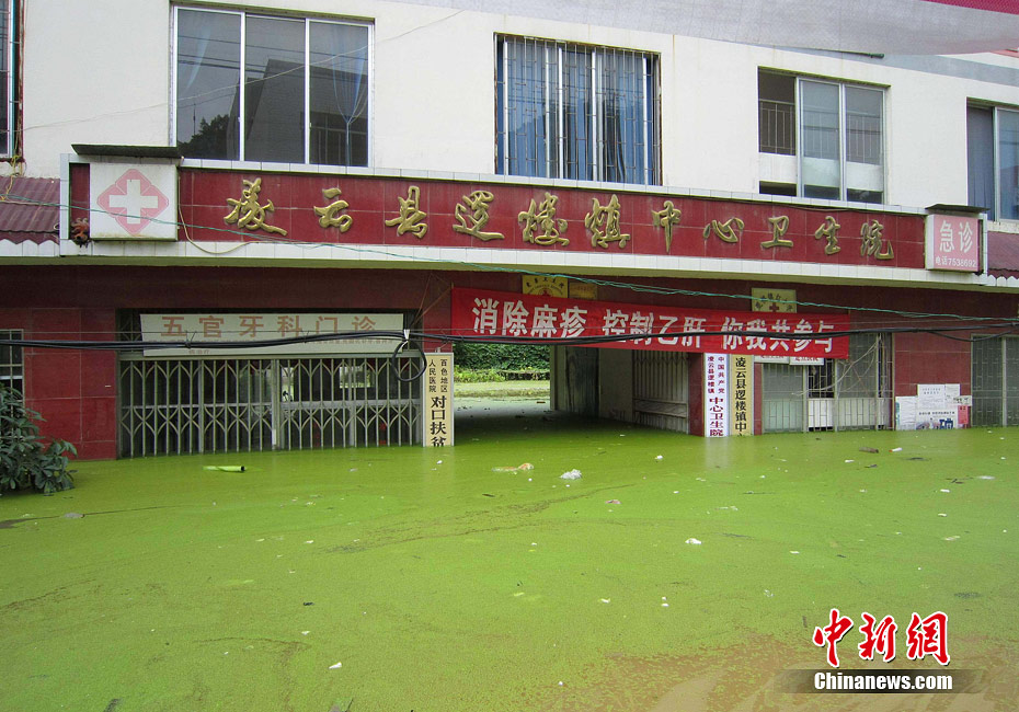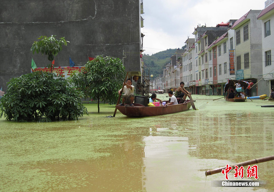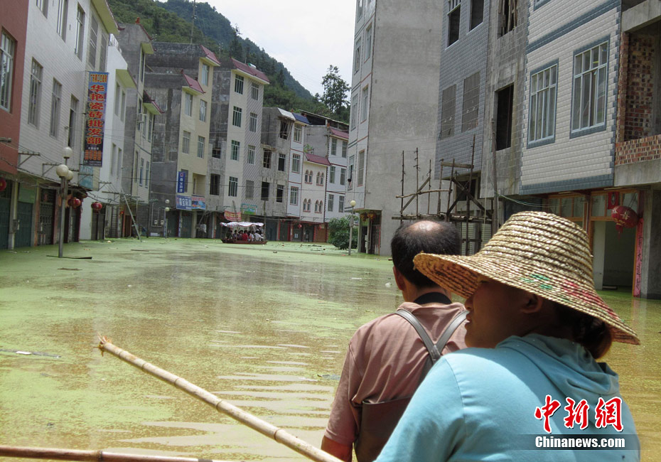 由于遭遇連日暴雨,廣西凌云縣邏樓鎮(zhèn)內(nèi)澇成災(zāi),全鎮(zhèn)一片汪洋,積水深達(dá)2米多高,民眾只能用小機(jī)船和自制排伐作為交通工具。由于該鎮(zhèn)所在地為一個(gè)小盤地,沒有排水的地方,估計(jì)一個(gè)月后積水才能自然排完。6月27日20時(shí)至29日,廣西凌云縣遭遇罕見強(qiáng)降雨襲擊,造成嚴(yán)重洪澇災(zāi)害。初步統(tǒng)計(jì),當(dāng)?shù)匾丫o急轉(zhuǎn)移一萬(wàn)多人。圖為30日所攝邏樓鎮(zhèn)被淹景象。黃燕飛 攝