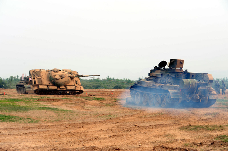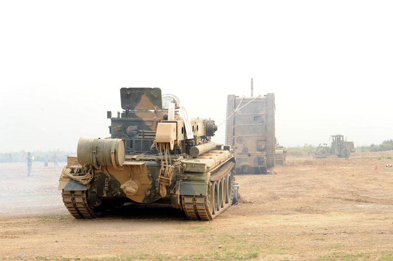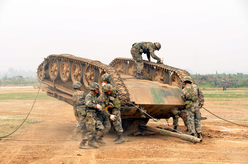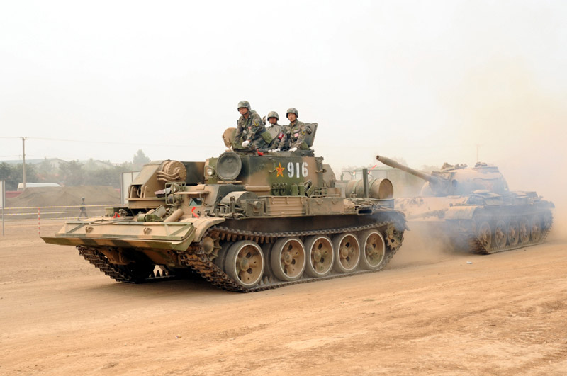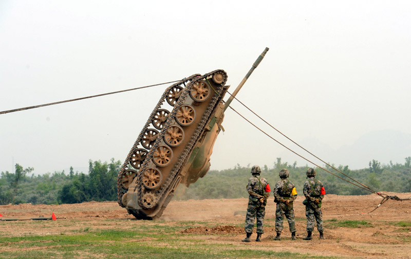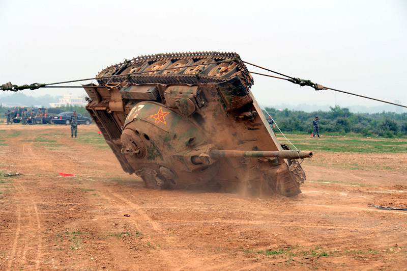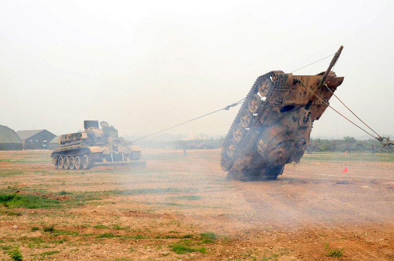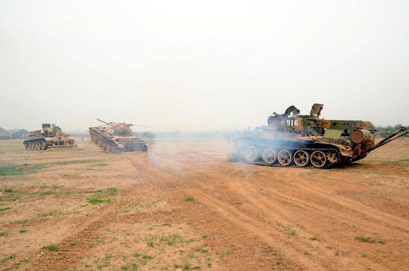 6月29日,北京軍區(qū)基礎(chǔ)比武進入第二天,裝甲搶救車牽引訓(xùn)練坦克駛?cè)氡任洮F(xiàn)場。圖片來源:新華網(wǎng) 高航 攝