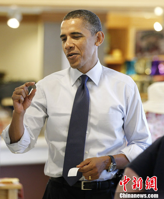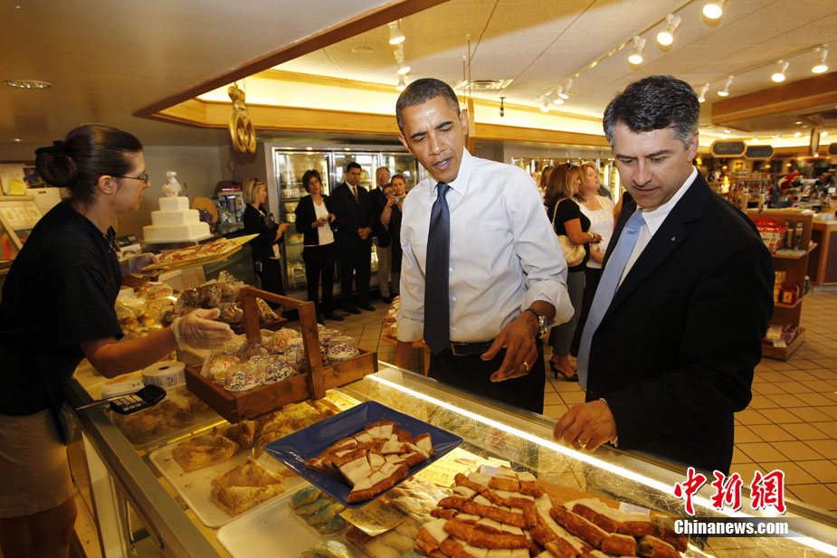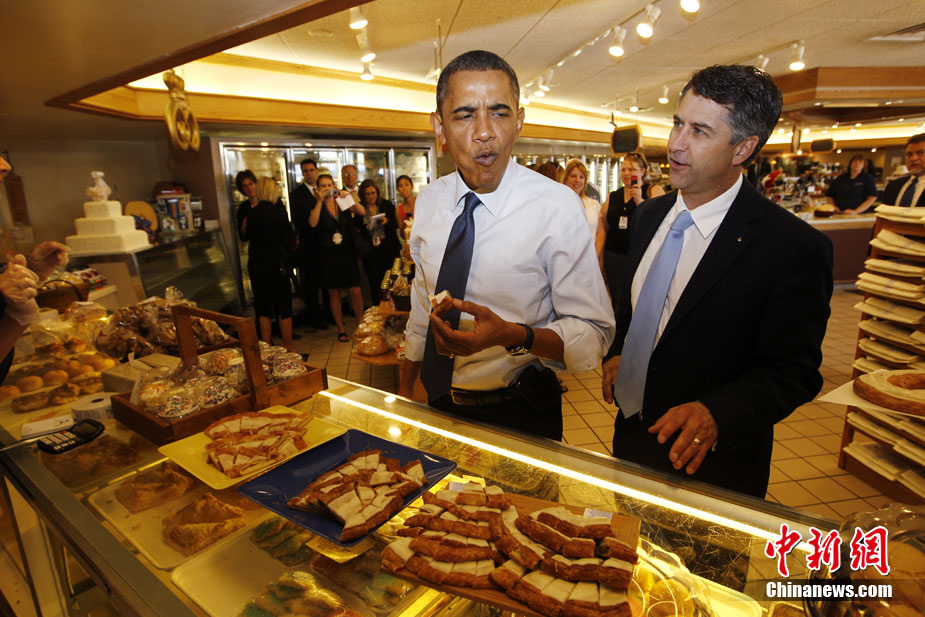 6月30日,美總統(tǒng)奧巴馬和威斯康星州拉辛市市長在前往出席市政廳會(huì)議的路上拐進(jìn)一家面包店,品嘗甜點(diǎn)。
