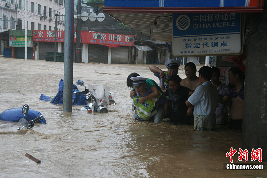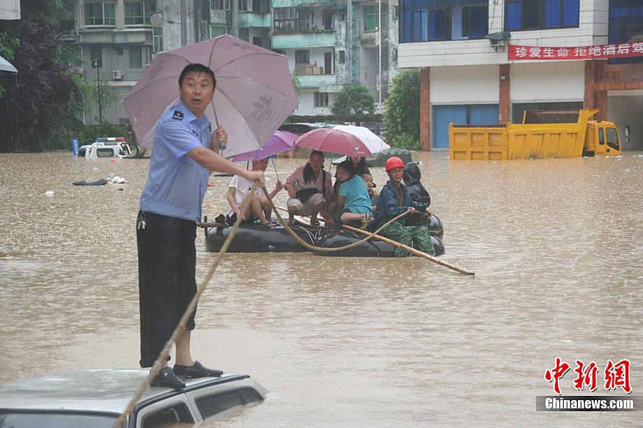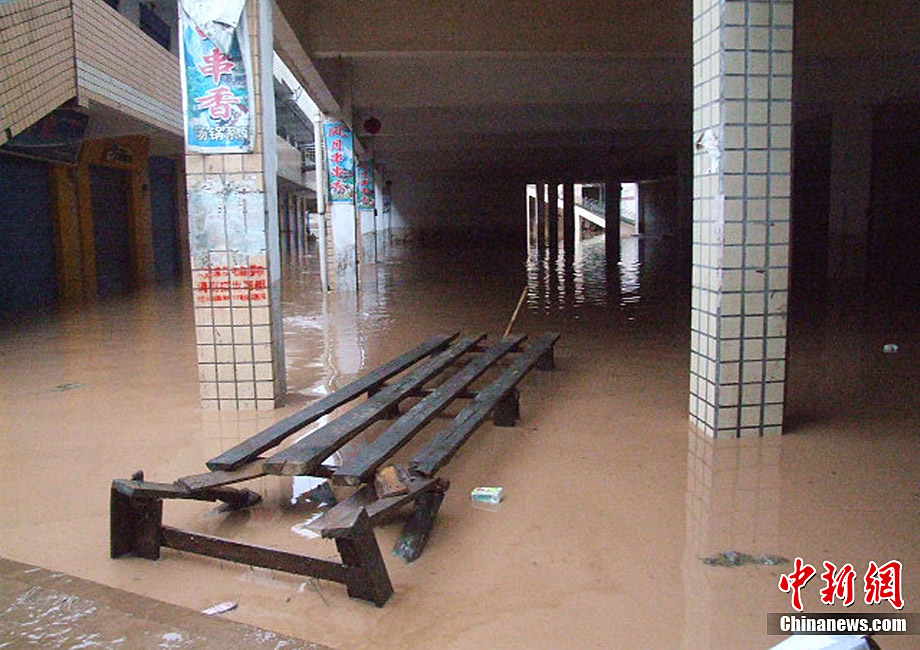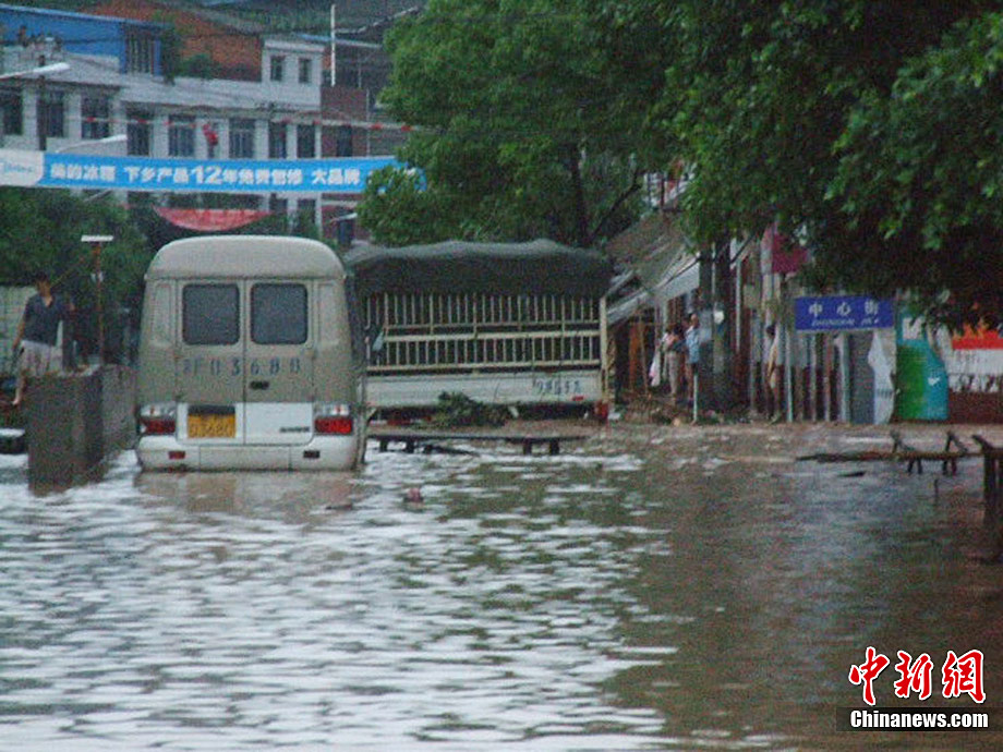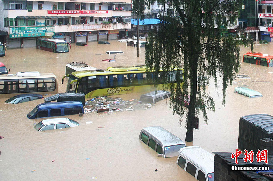 7月9日,重慶酉陽縣城一個停車場被洪水淹沒。8日21時開始,重慶市酉陽縣各地出現(xiàn)今年入汛以來最強降水,導致該縣眾多地勢較低洼地方被淹。截至9日8時,該縣平均降水量達151.4毫米,目前當?shù)亟涤耆栽诔掷m(xù)。中新社發(fā) 黃勝華 攝