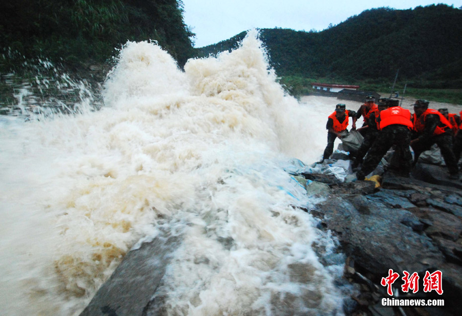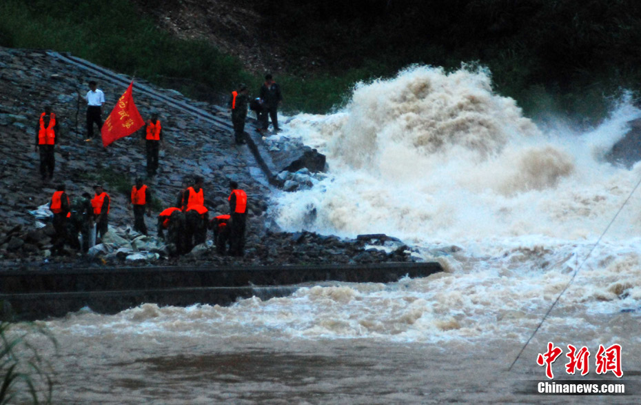 中新網(wǎng)都昌7月14日電(胡國(guó)林)14日,受強(qiáng)降雨襲擊,江西九江市都昌大港鎮(zhèn)梅溪水庫(kù)水位超過(guò)泄洪道1米左右,啟閉設(shè)備出現(xiàn)失靈,洪水如猛獸般狂瀉入下,部分村莊和數(shù)千畝農(nóng)田被淹。 險(xiǎn)情發(fā)生后,當(dāng)?shù)胤姥床块T立即組織抗洪搶險(xiǎn)突擊隊(duì),武警官兵和當(dāng)?shù)厝罕娒爸kU(xiǎn),拋石加固堤壩,防止洪庫(kù)潰堤,下游數(shù)千名村民已被安全轉(zhuǎn)移。