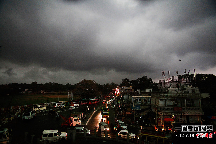 周一(12日),烏云籠罩著印度的查謨。當?shù)匾堰M入季風雨季。