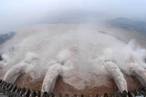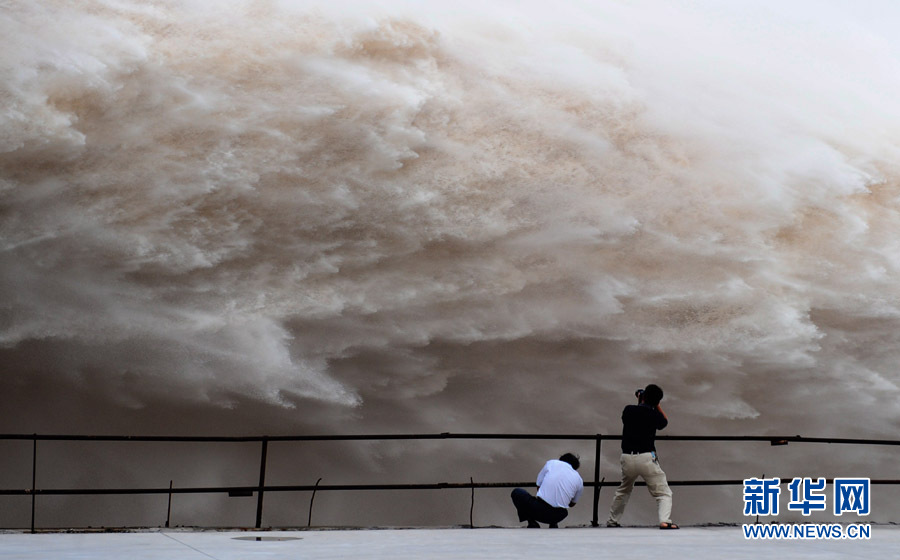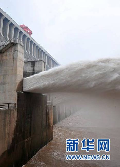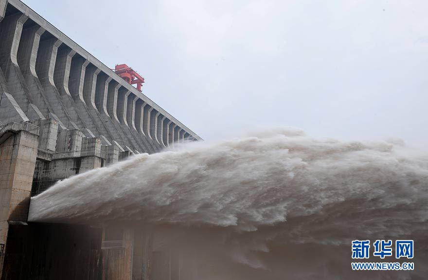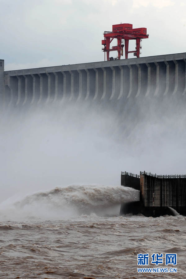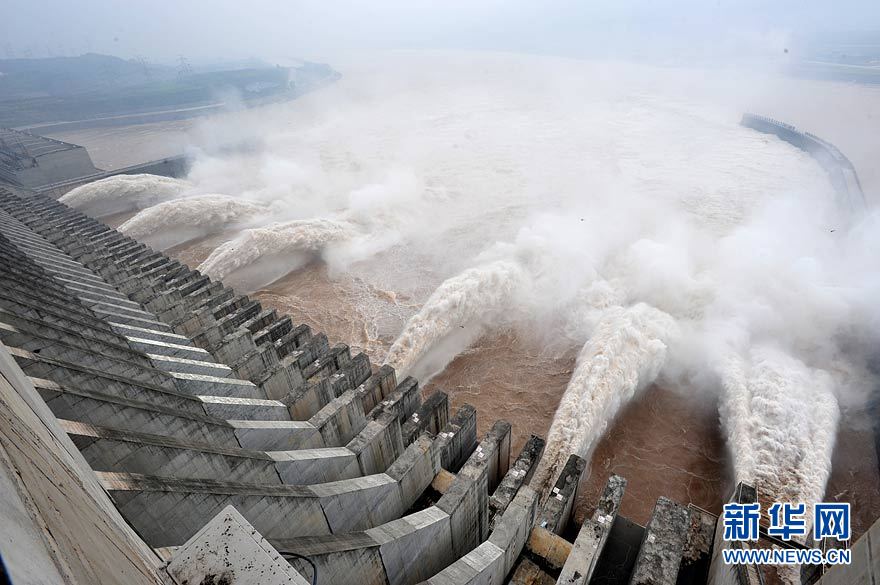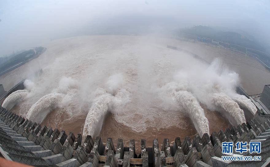 7月19日,三峽大壩開(kāi)啟6個(gè)泄洪深孔和一個(gè)排漂孔泄洪。當(dāng)日上午8時(shí),三峽水庫(kù)入庫(kù)流量增至58000立方米/秒,再創(chuàng)今年入汛以來(lái)新高。長(zhǎng)江三峽集團(tuán)公司目前正按長(zhǎng)江防總最新調(diào)度令,從19日10時(shí)起,再度加大泄洪力度,將出庫(kù)流量調(diào)高到40000立方米/秒,積極迎戰(zhàn)建庫(kù)以來(lái)的最大洪峰。據(jù)長(zhǎng)江水文局最新預(yù)報(bào),長(zhǎng)江上游正在形成一場(chǎng)大洪水,洪峰流量將逼近70000立方米/秒。 鄭家裕 攝(圖片來(lái)源:新華網(wǎng))