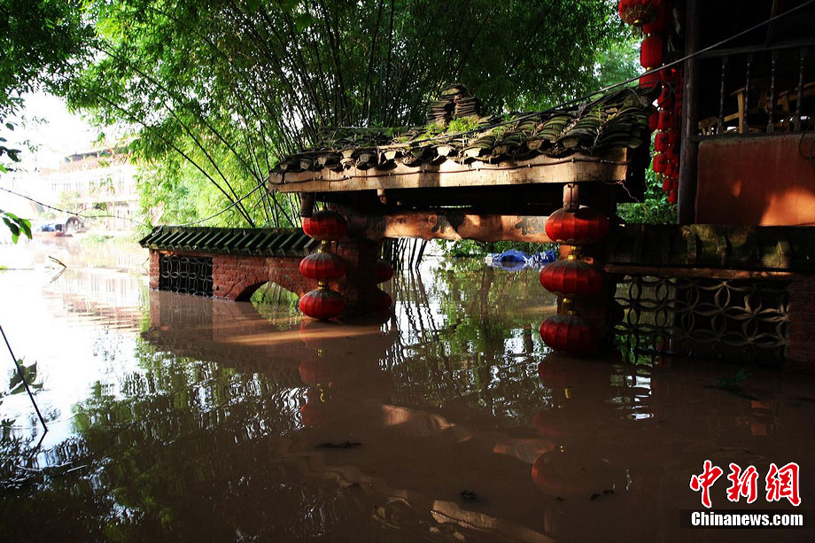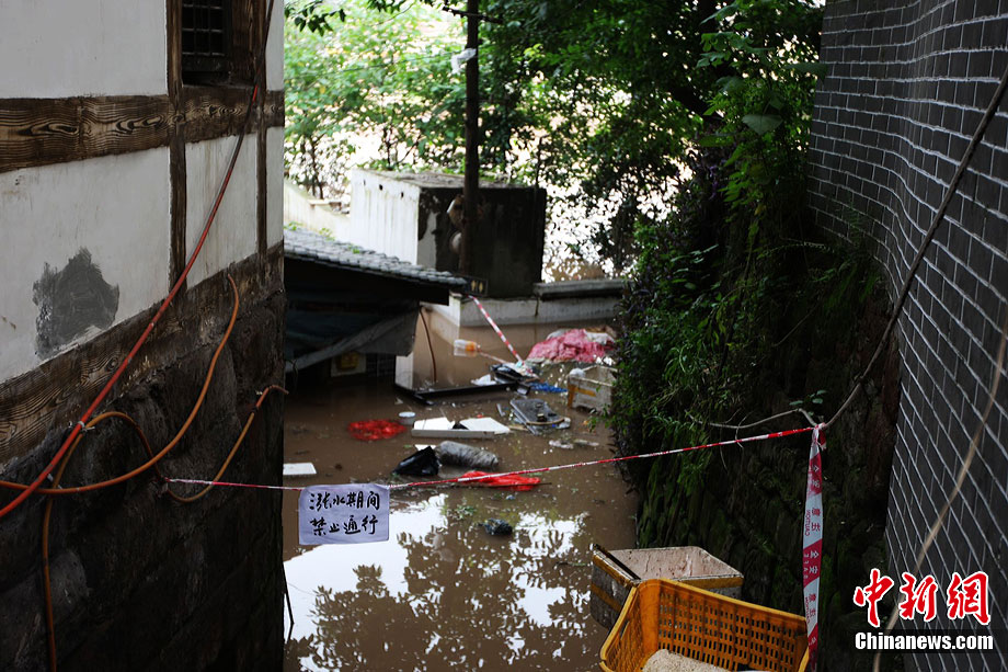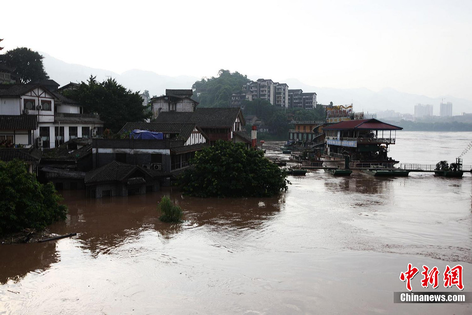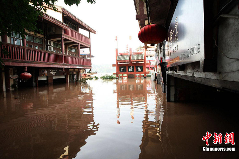 7月19日,今年入汛以來最大洪峰經(jīng)過重慶主城,長江、嘉陵江水位上漲。記者在重慶古鎮(zhèn)磁器口看到,從磁器口江邊至磁器口街道的梯坎已“隱”于水面下,標志性牌匾龍隱門沒至“腰部”,靠近江邊的商鋪及民居被淹。目前,大部分商家、市民接預(yù)警已提前撤場歇業(yè)或撤離至安全地帶。截至記者趕赴磁器口途中,部分必經(jīng)路段已實施交通管制,磁器口正街漲水期間亦采取禁行措施。據(jù)長江水利委員會水文局監(jiān)測數(shù)據(jù),19日20時長江重慶寸灘站水位超過185米,這是重慶遭遇的長江今年以來最大洪峰。截至20日0時,長江重慶水位仍在185.06米的峰值上流動,洪峰仍在過境重慶。 劉函冉 攝
