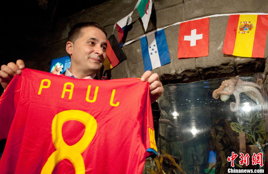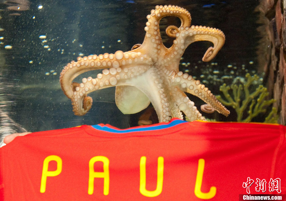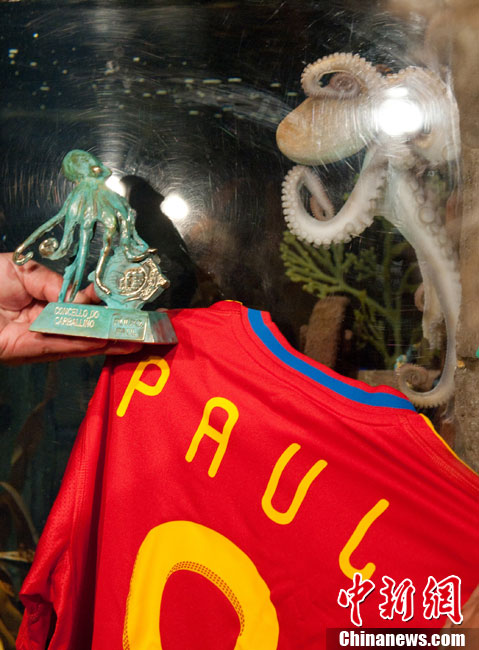 近日,曾在2010年南非世界杯上大放異彩的“章魚哥”保羅再獲殊榮。西班牙卡瓦利諾市市長在德國奧博豪森水族館正式贈送給保羅一件印有它名字的西班牙隊隊服和保羅自己的青銅像,稱保羅為“城市最好的朋友”。