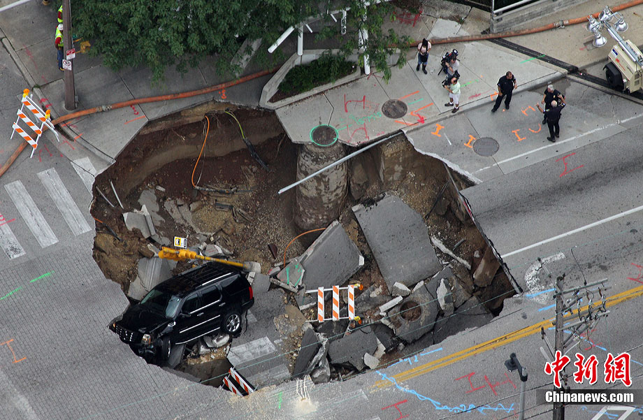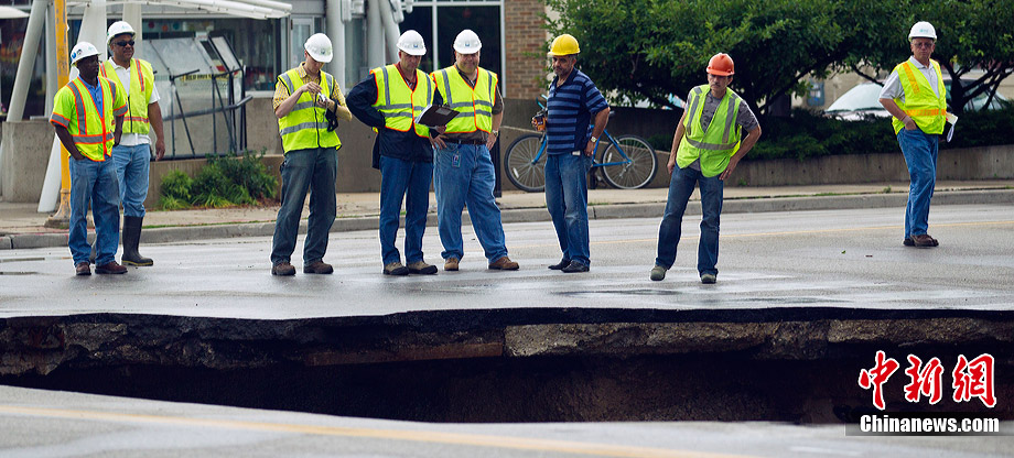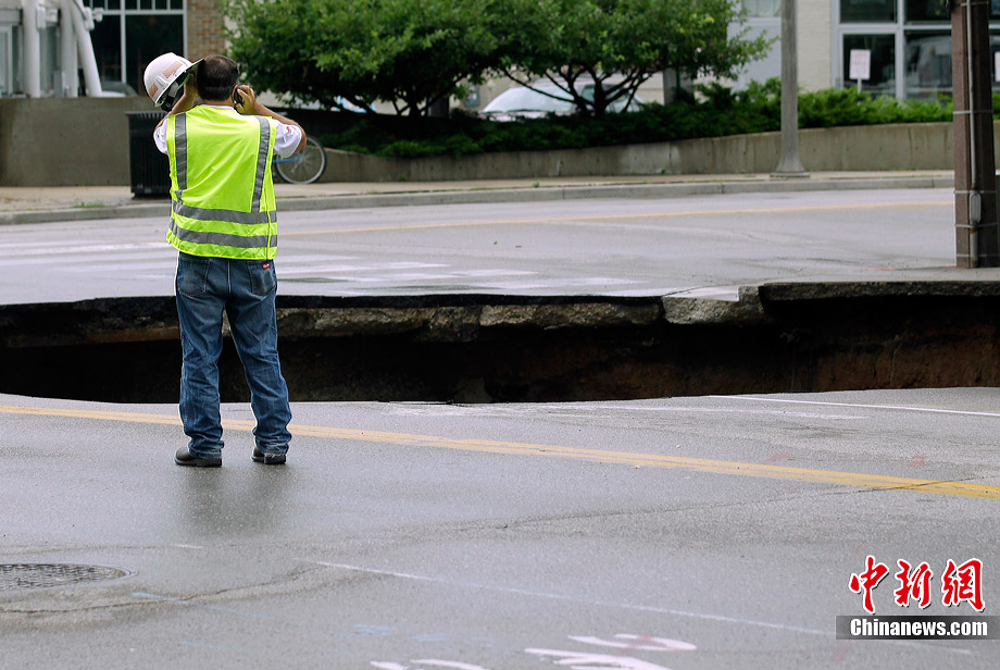 當(dāng)?shù)貢r間7月23日,美國南部威斯康星州遭遇強(qiáng)烈暴風(fēng)雨襲擊,造成當(dāng)?shù)亟值赖孛嫠莩霈F(xiàn)大洞,路過的汽車不慎掉入洞中。暴風(fēng)雨還造成當(dāng)?shù)囟嗵幒樗簽E。
