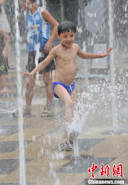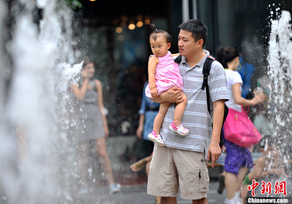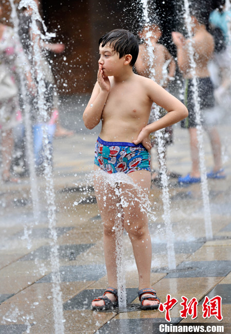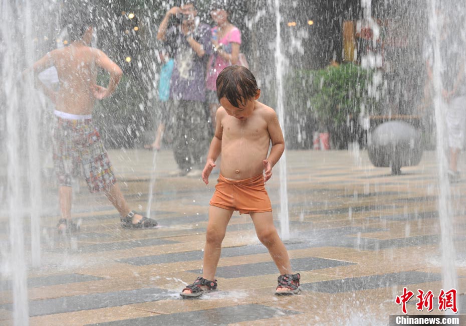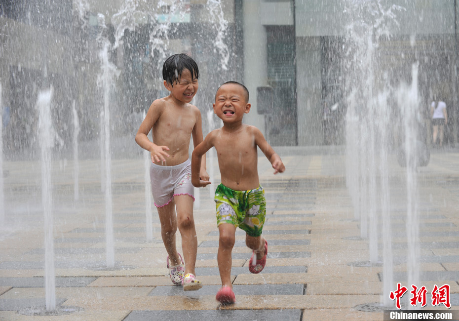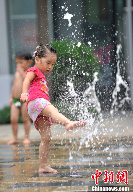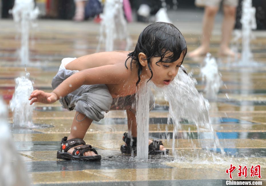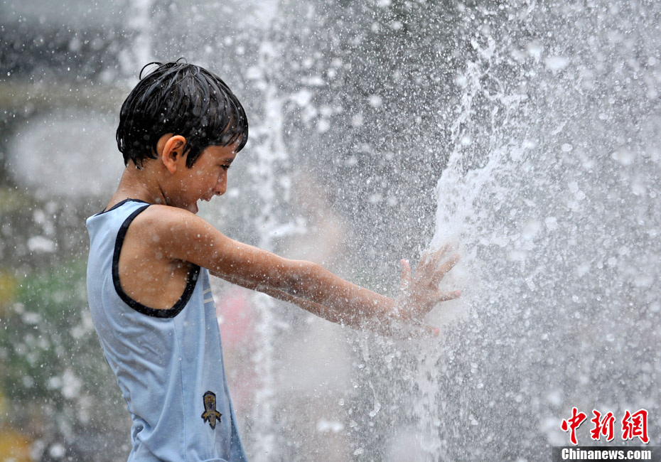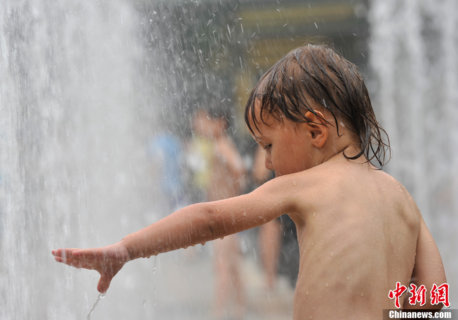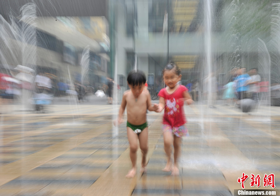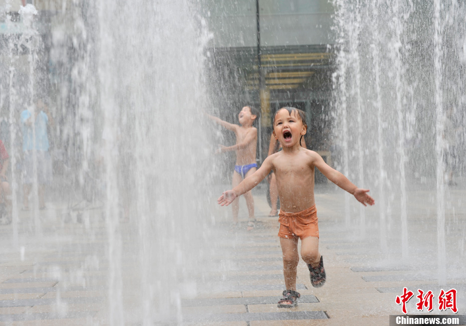 近日,北京持續(xù)的高溫使“桑拿天”的感覺越來越強(qiáng)烈。中央氣象臺(tái)繼續(xù)發(fā)布高溫藍(lán)色預(yù)警,預(yù)計(jì)未來三天,新疆吐魯番盆地和南疆盆地、甘肅西部、內(nèi)蒙古大部有35-37℃的高溫天氣,新疆吐魯番盆地、內(nèi)蒙古中西部的部分地區(qū)最高氣溫可達(dá)42℃以上;陜西東北部、山西北部、河北中西部、北京大部、天津西部、重慶大部、江南中西部等地有35℃以上的高溫天氣,局地最高氣溫可達(dá)37~38℃。圖為7月26日北京三里屯一處噴泉引來許多中外小朋友戲水享清涼。中新網(wǎng)記者 金碩 攝