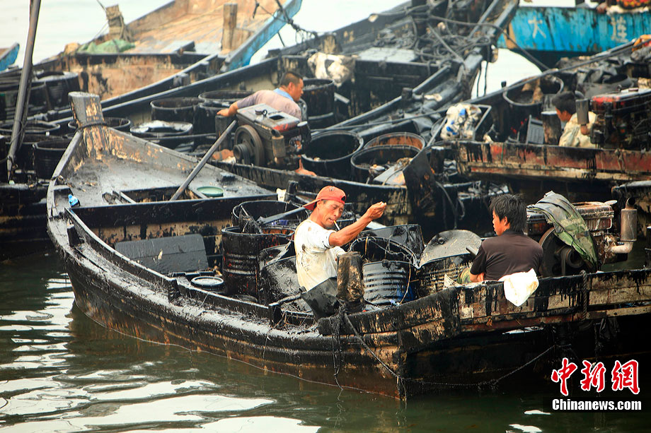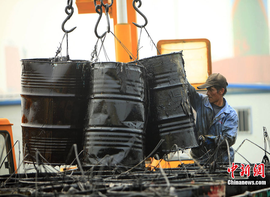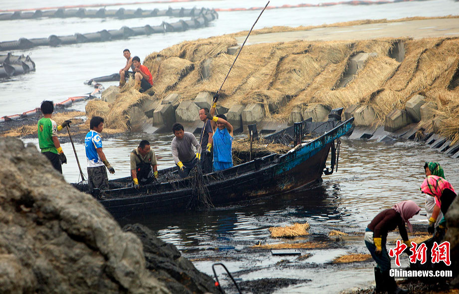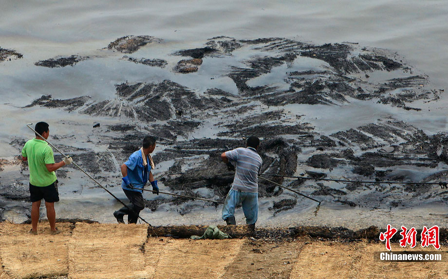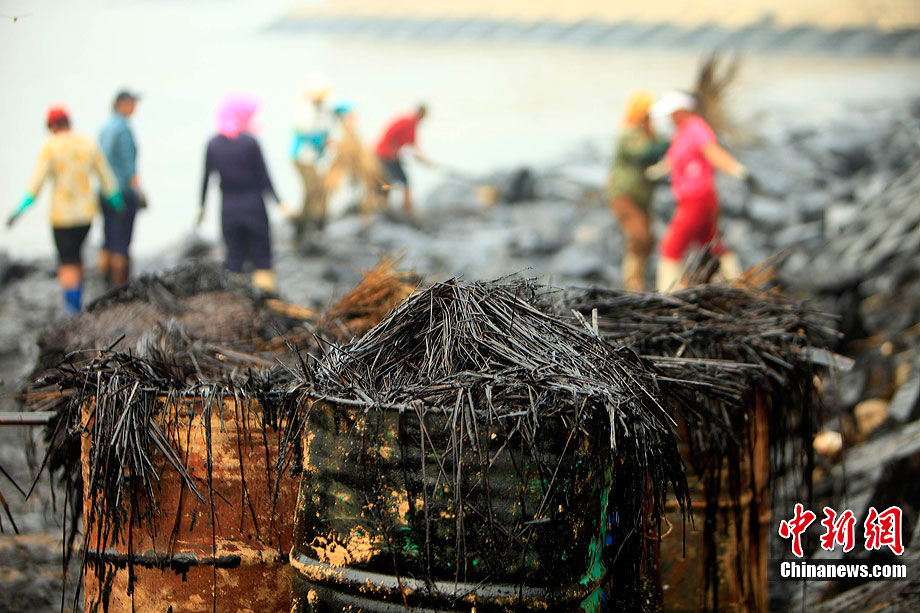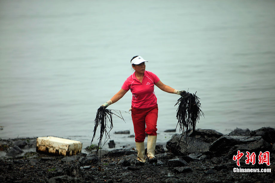 7月31日,清污人在大連大孤山附近海域沙灘上清理被海水沖到岸邊的污染物,其中很多是女性。距離大連“7·16”輸油管道爆炸火災(zāi)事故已經(jīng)半月之久了,雖然事故尚未最后認(rèn)定,但事故方中石油為了善后此事,初步核算已花費(fèi)至少數(shù)億。漏油事發(fā)的大連新港位于大孤山半島,三面環(huán)海,南臨大連灣,北面與大窯灣毗鄰,東朝黃海,隸屬大連保稅區(qū),距大連市區(qū)約25公里。中新社發(fā) 杜洋 攝