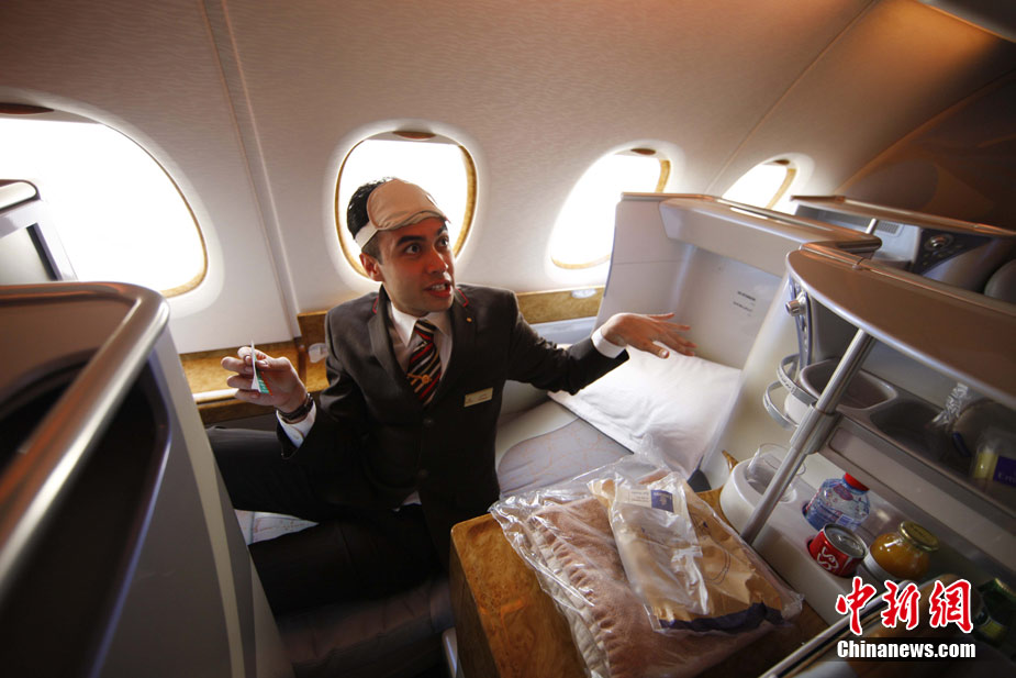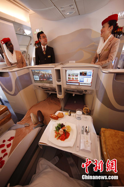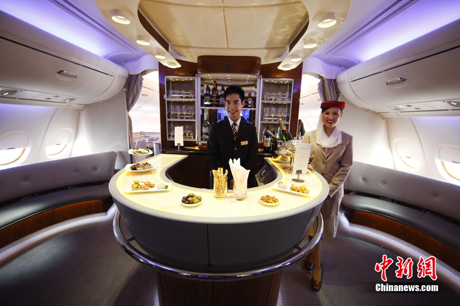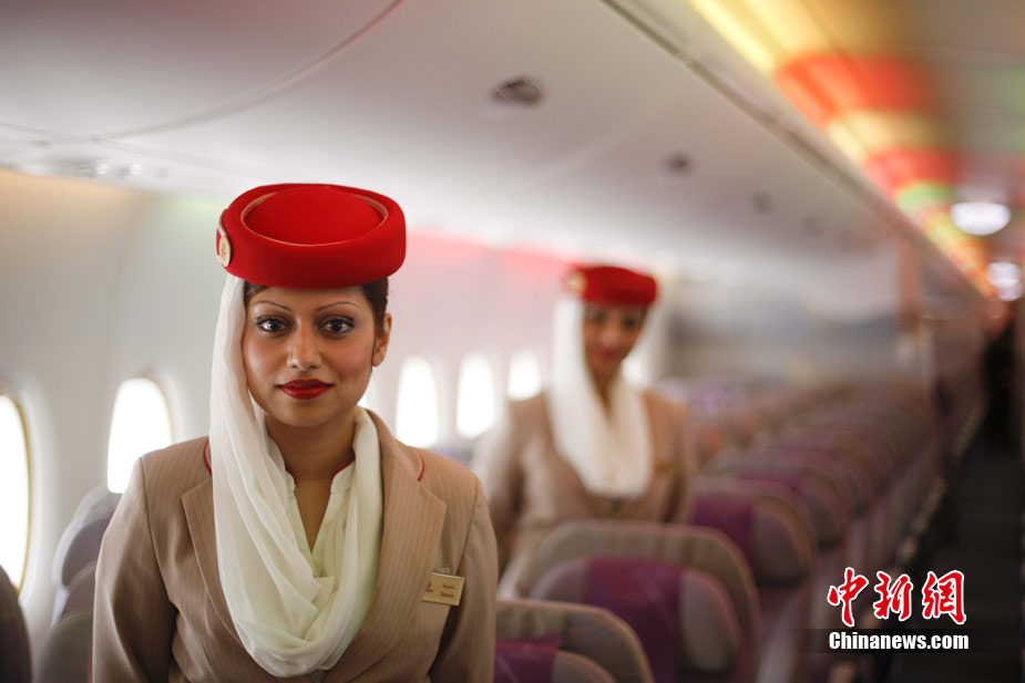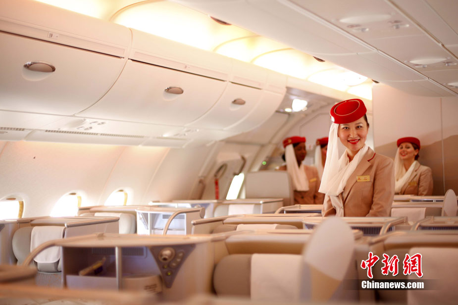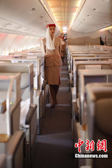 阿航A380 客機頭等艙內(nèi)共有14個私人套間,設有兩間設備齊全的淋浴房,帶按摩功能的座椅可平躺成床。頭等艙和商務艙乘客還能享受如私人會所般、提供冷熱小點和酒品飲料的機上酒廊社交區(qū)。商務艙的座椅可放平成2米長的床,而經(jīng)濟艙的座椅可以傾斜多達33英寸,讓乘客自由舒展身體。所有艙位的乘客都可以享用阿航多達1200個頻道的數(shù)碼寬屏機上娛樂系統(tǒng),該系統(tǒng)提供空中娛樂節(jié)目。圖為阿聯(lián)酋航空空客A380上的空姐。中新社記者 盛佳鵬 攝