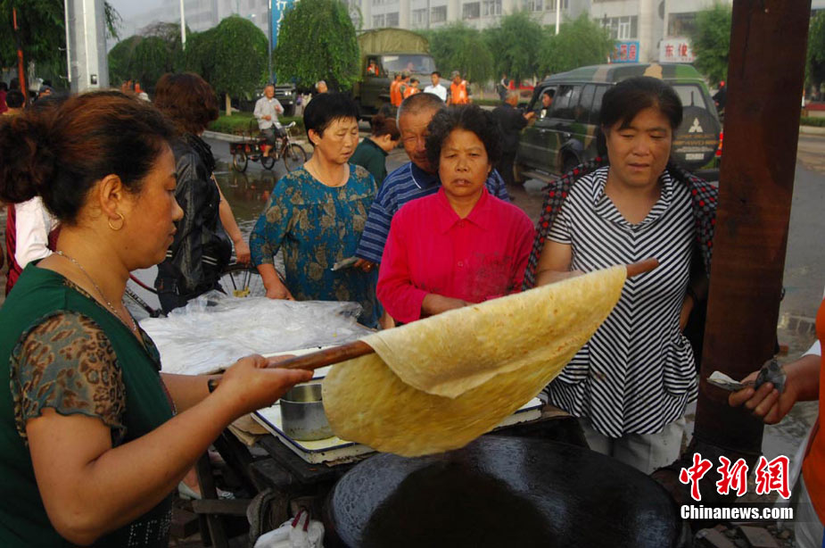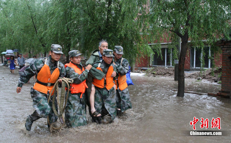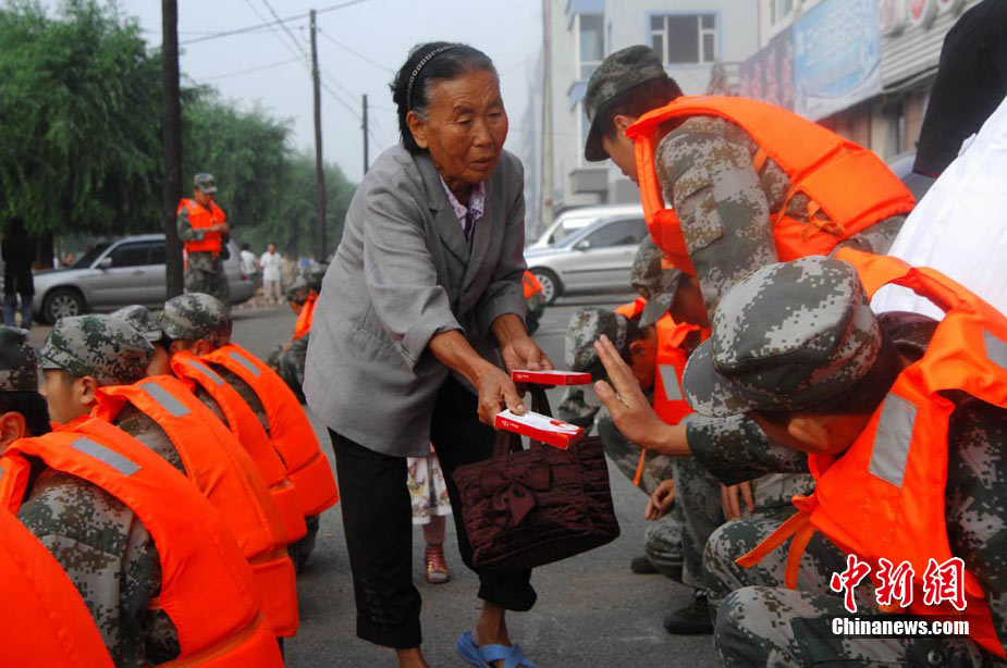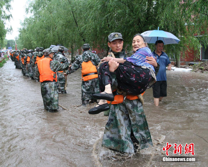 28日以來的一場暴雨讓吉林省多個(gè)地區(qū)遭遇罕見洪災(zāi),此后對災(zāi)區(qū)的救援緊張進(jìn)行。目前在永吉縣口前鎮(zhèn),已有部分商戶恢復(fù)營業(yè)。圖為在重災(zāi)區(qū)永吉縣,士兵將一名老婦轉(zhuǎn)移到安全地帶。中新社記者 張杰 攝