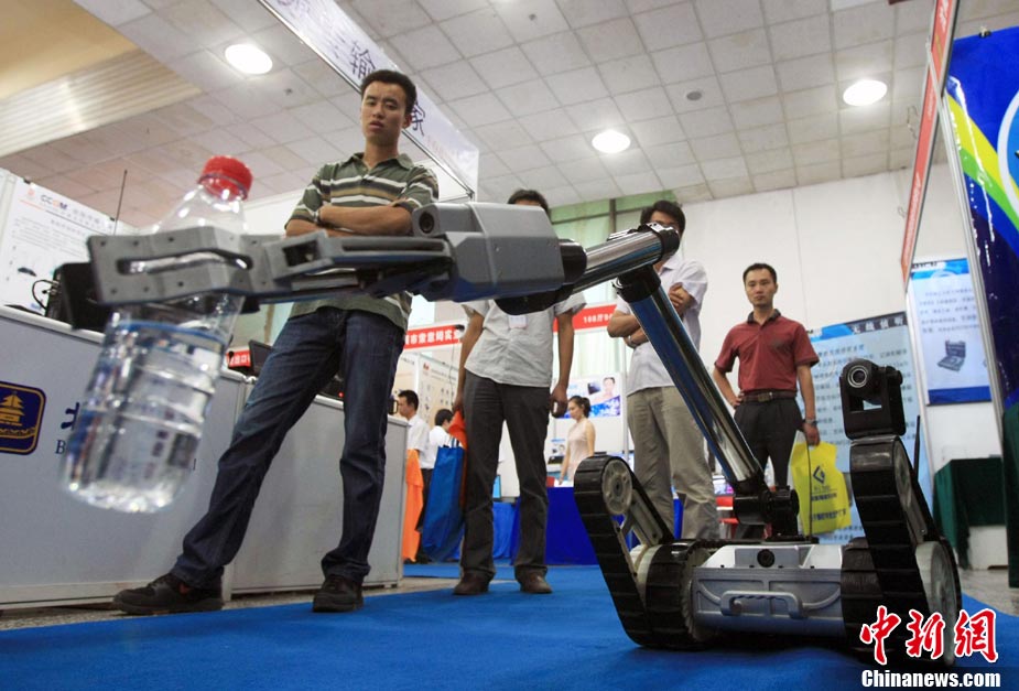 8月4日,2010新疆警用技術(shù)裝備暨社會公共安全產(chǎn)品博覽會(簡稱安博會)在烏魯木齊開幕,一部新型排爆機(jī)器人亮相本屆安博會,現(xiàn)場抓起礦泉水瓶。據(jù)了解,本屆安博會吸引了來自美國、英國、意大利等國家和地區(qū)的安保設(shè)備生產(chǎn)企業(yè)前來參展,并匯集大批警用應(yīng)急指揮車、防爆摩托車、槍支武器、坦克車、智能機(jī)器人等平日不常見到的警用技術(shù)裝備,成為安博會開辦以來規(guī)模最大、參展產(chǎn)品最多樣的一次盛會,令到場參觀民眾大開眼界。中新社發(fā) 劉新 攝