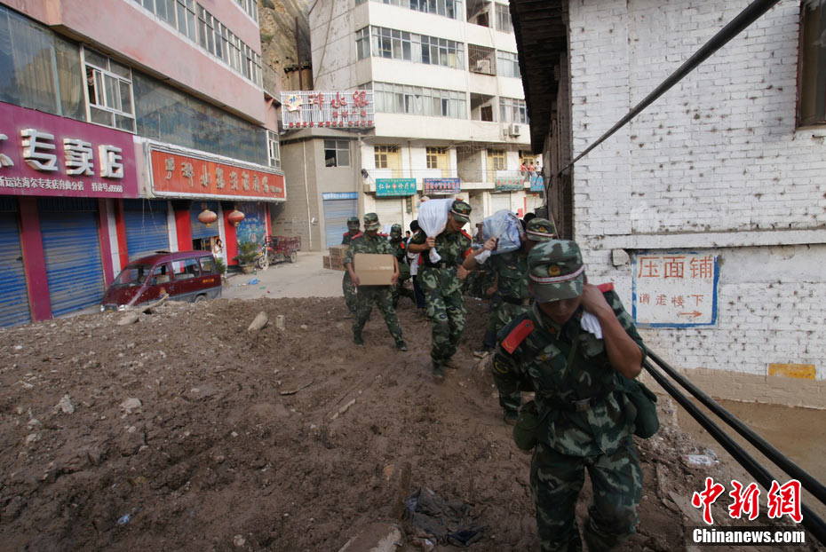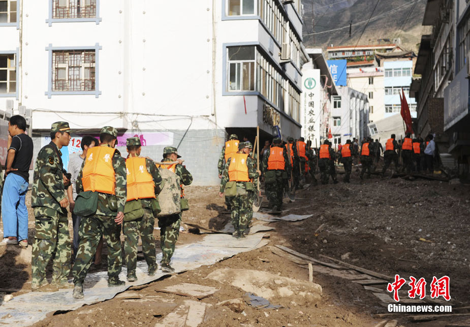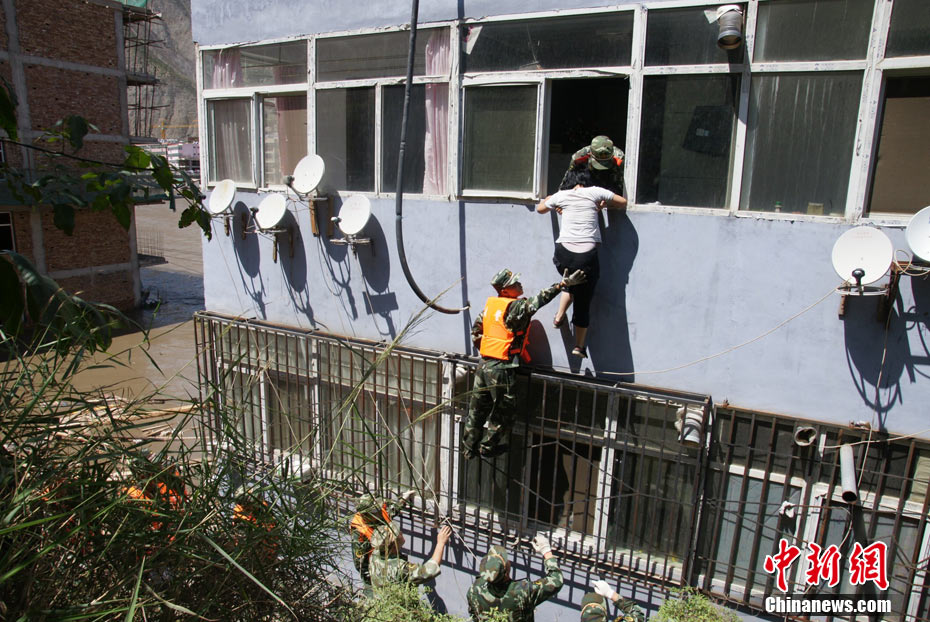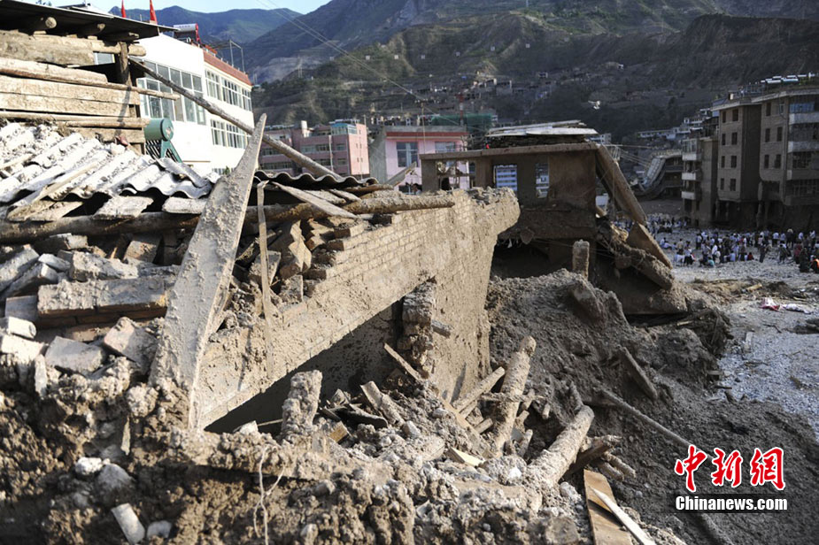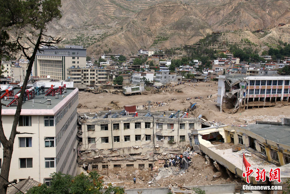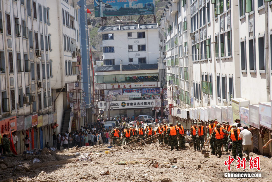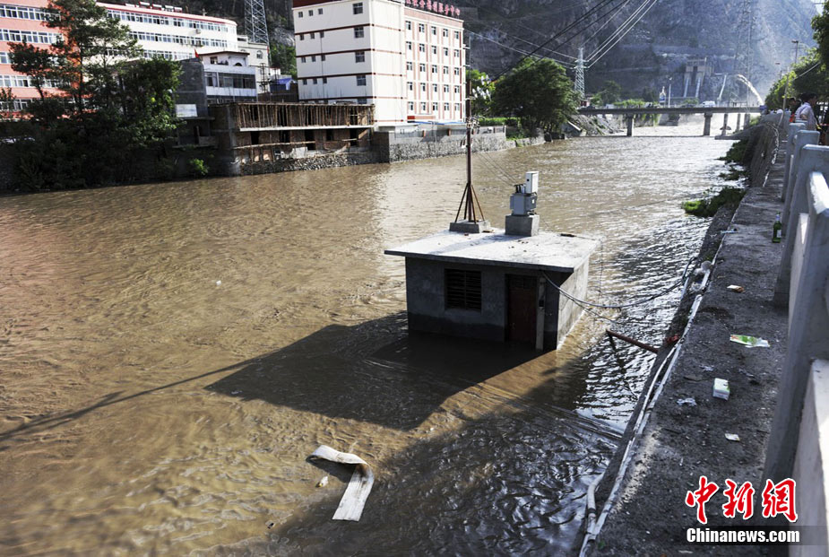 8月8日下午17時(shí)58分,白龍江水位有所下降。8月8日凌晨,甘肅省舟曲縣因強(qiáng)降雨引發(fā)滑坡泥石流,造成重大人員傷亡,電力、交通、通訊中斷。8月7日22時(shí)許,甘肅甘南州舟曲縣出現(xiàn)持續(xù)強(qiáng)降雨天氣,暴雨造成舟曲水文站下游100米處的羅家溝發(fā)生泥石流,堵塞白龍江,舟曲縣城部分被淹。中新社發(fā) 張永進(jìn) 攝