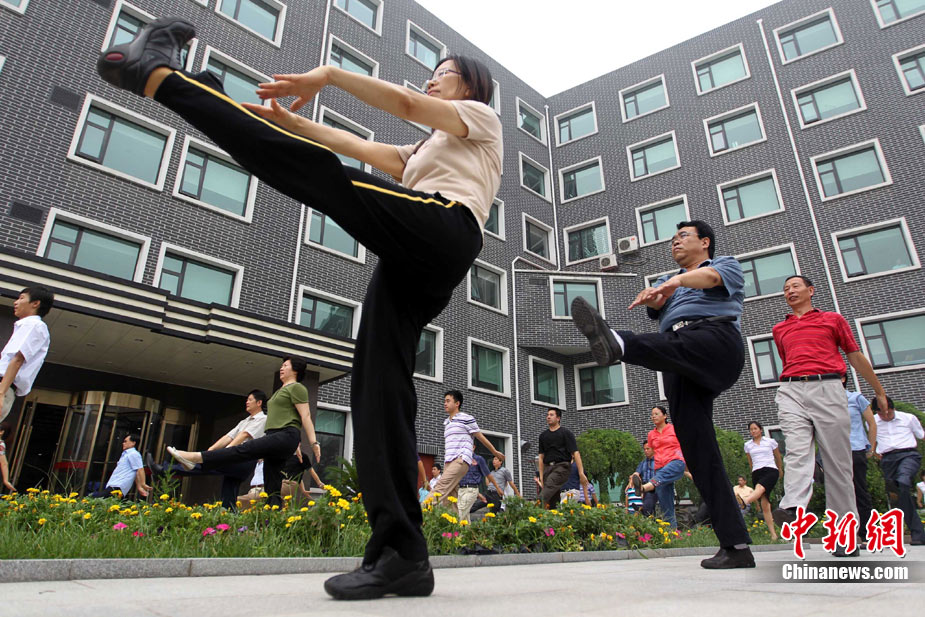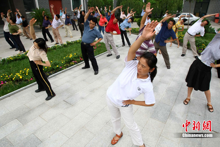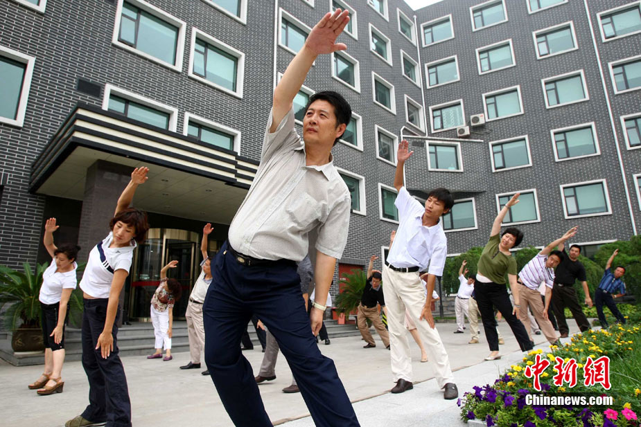 8月9日,北京化工集團(tuán)的職工在工間時段集體做廣播體操。當(dāng)日,北京恢復(fù)廣播體操,電臺在每天10時和15時連續(xù)播放兩次第八套廣播體操音樂,時長為8分鐘左右。此次,北京市總工會定下目標(biāo),2011年全市職工參與健身活動比例要達(dá)到60%以上,國有企業(yè)參與工間或工前操活動要達(dá)到100%,機關(guān)事業(yè)單位要達(dá)到70%。中新社發(fā) 富田 攝