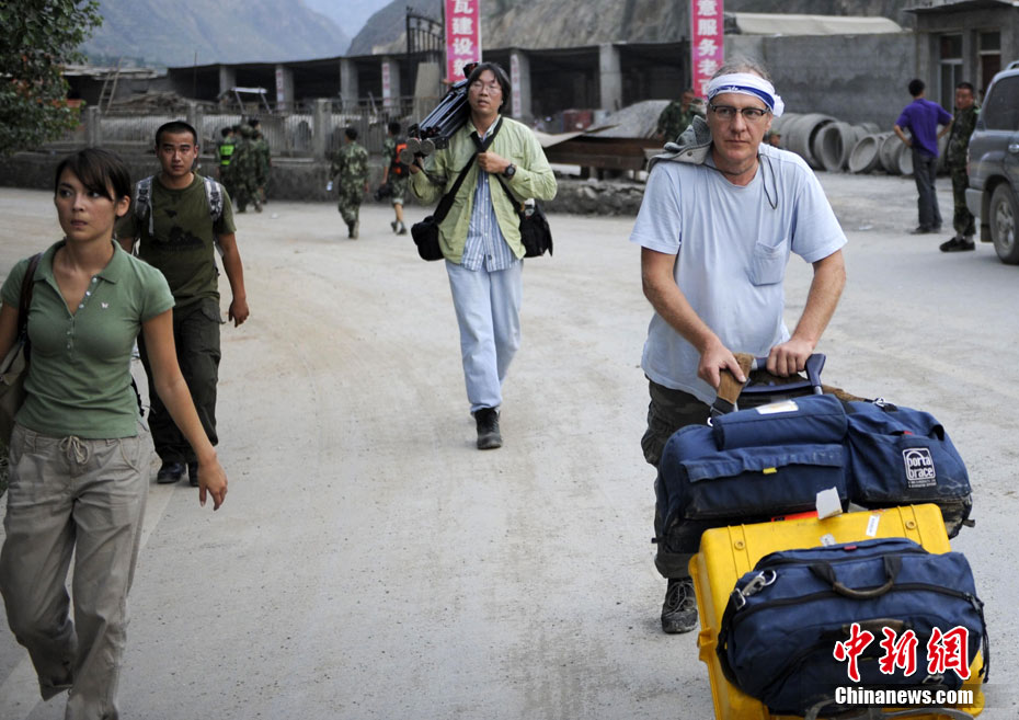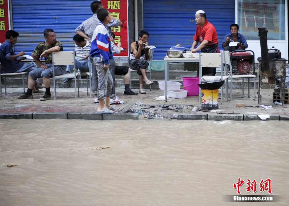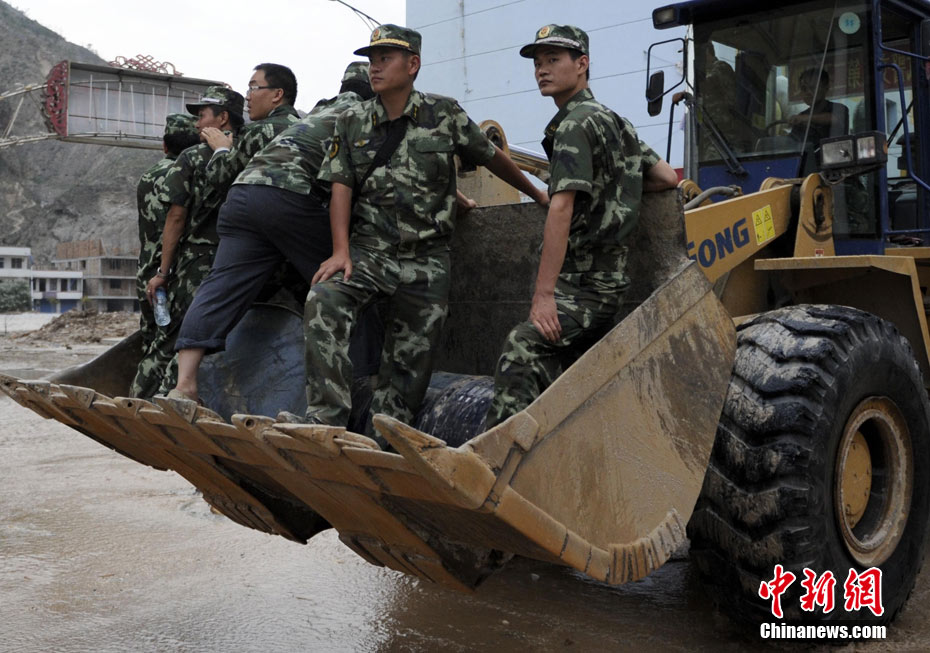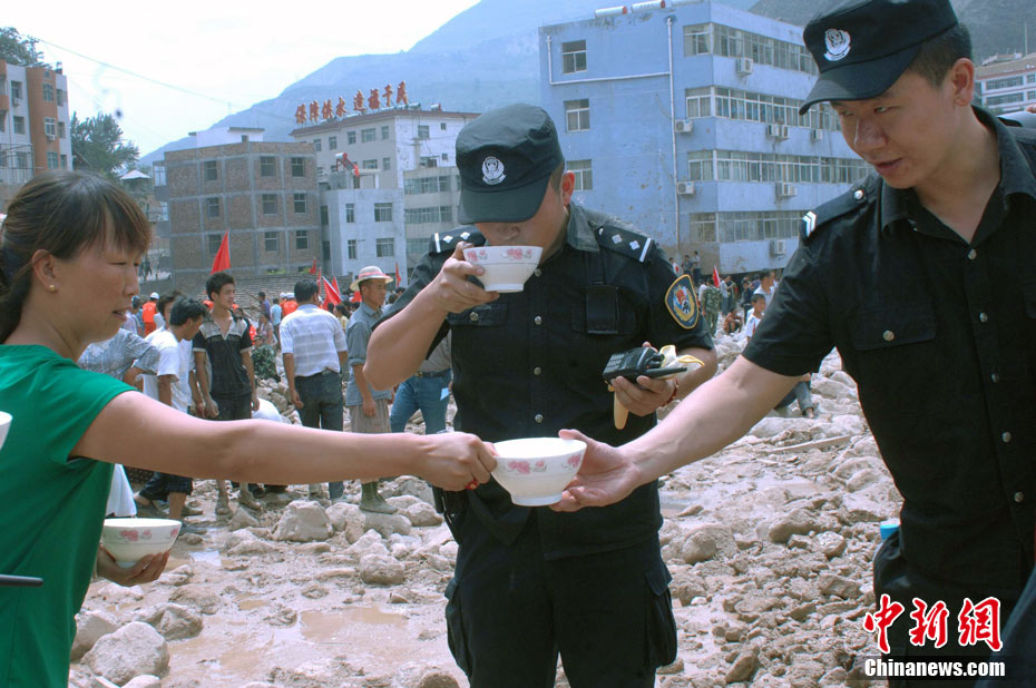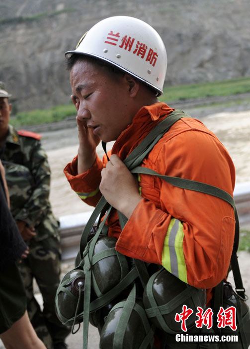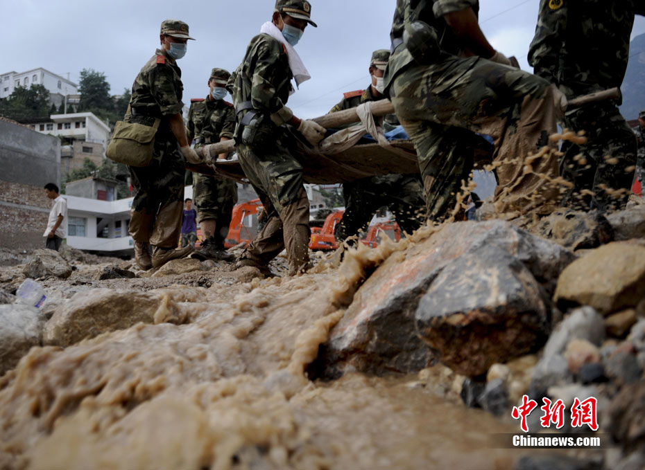 8月9日,甘肅舟曲泥石流災(zāi)區(qū),武警戰(zhàn)士艱難涉水搶救受災(zāi)民眾。 中新社發(fā) 廖攀 攝