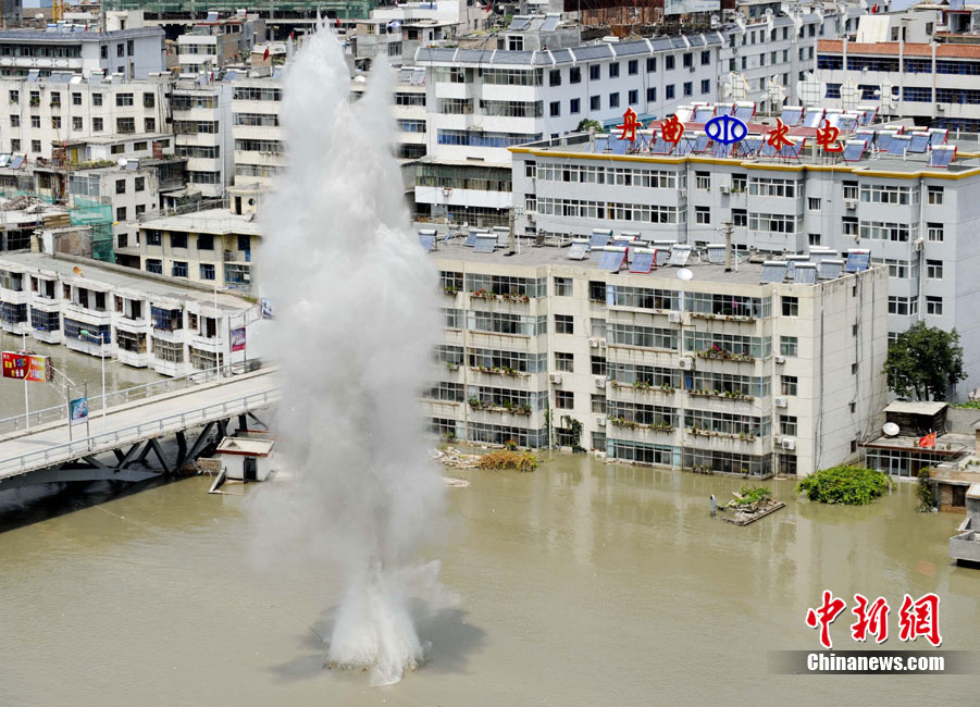 8月10日,甘肅舟曲泥石流災區(qū),蘭州軍區(qū)開山斧工兵團在泥石流造成的白龍江堰塞湖壩體上實施爆破。中新社發(fā) 廖攀 攝