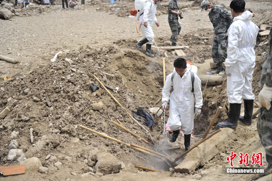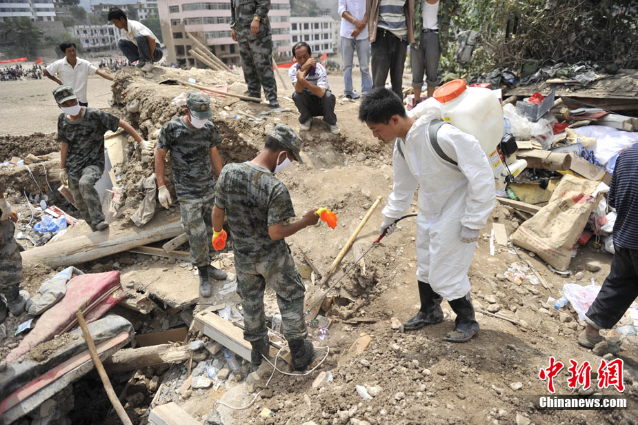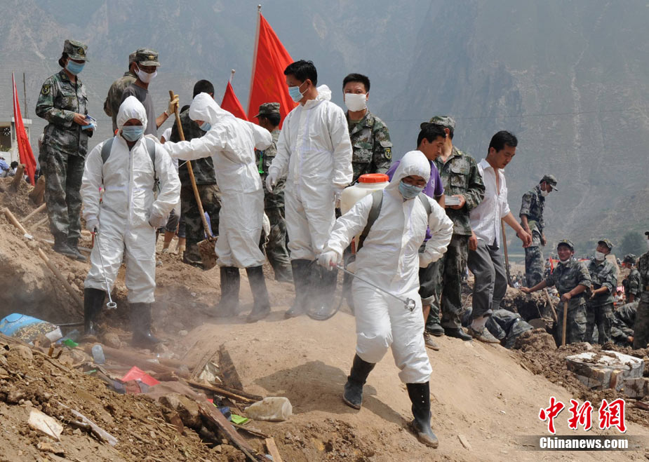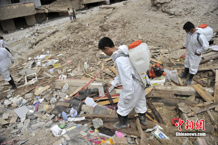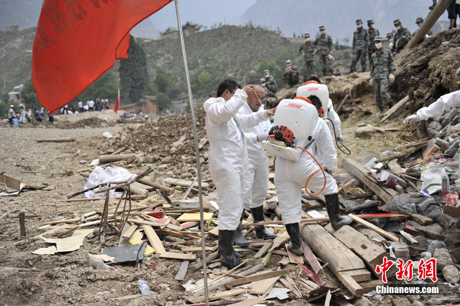 8月10日,甘肅舟曲泥石流災(zāi)區(qū)氣溫超過35攝氏度,醫(yī)療隊人員在救援現(xiàn)場噴灑消毒劑進行防疫消毒。中新網(wǎng)記者 金碩 攝