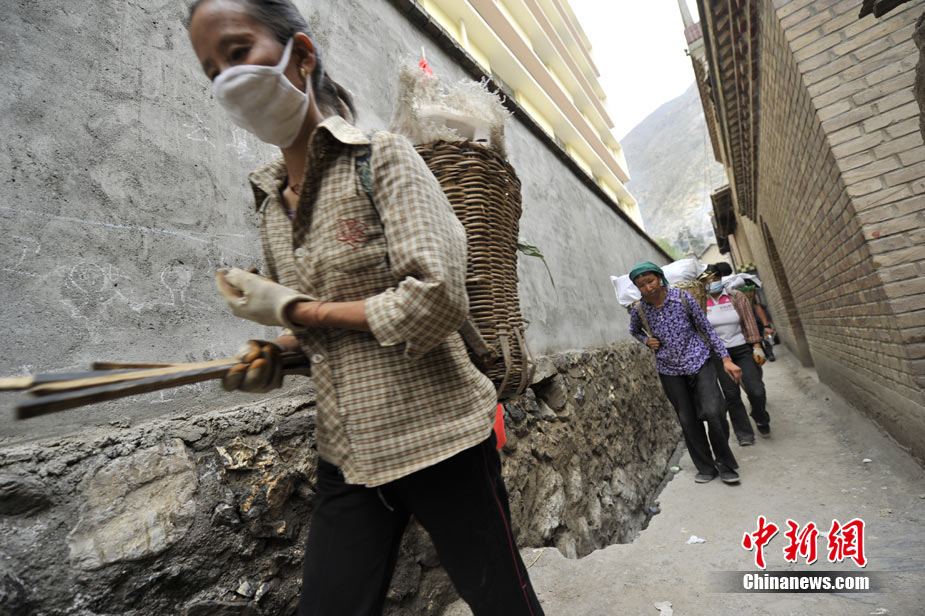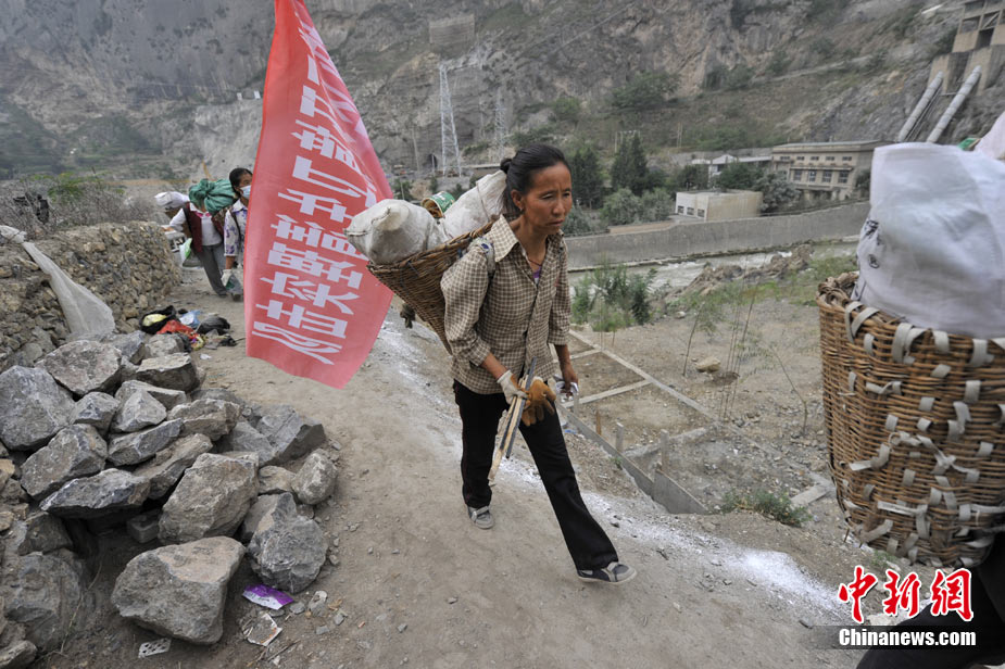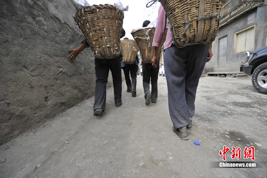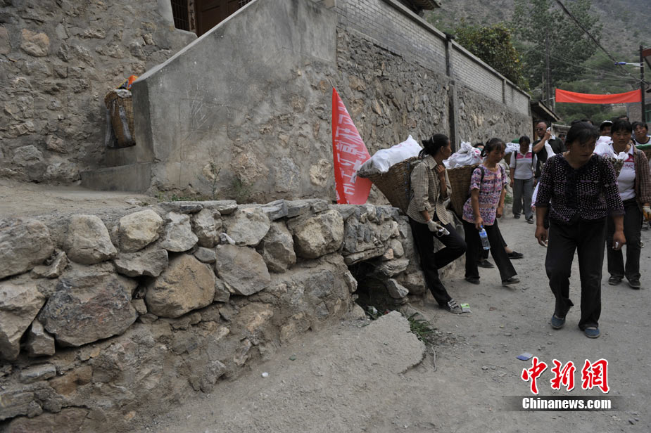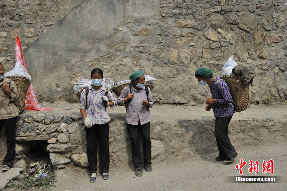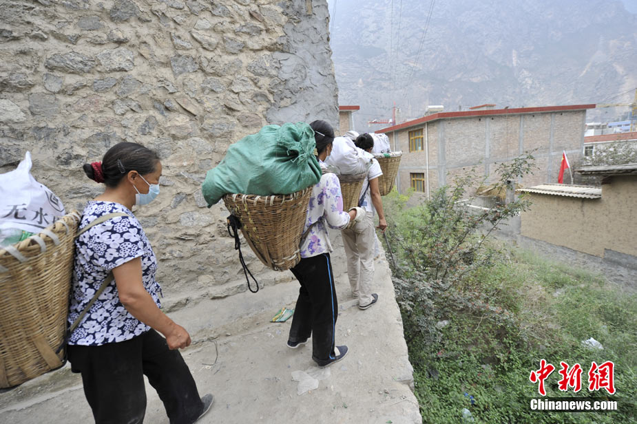 清晨8時(shí)許,舟曲鎖兒頭村的王旻桂和姐妹們來(lái)到城區(qū)。今天,她們的任務(wù)是將城區(qū)的生活垃圾清運(yùn)出去。這是一支“背簍突擊隊(duì)”——“城區(qū)環(huán)境衛(wèi)生清理突擊隊(duì)”的旗幟在王旻桂的背簍上飄揚(yáng)!氨澈t”這種當(dāng)?shù)卮迕裼脕?lái)搬運(yùn)物品的日常工具,在救災(zāi)任務(wù)繁忙、交通不暢時(shí),成為“利器”。