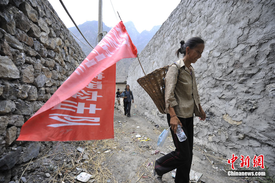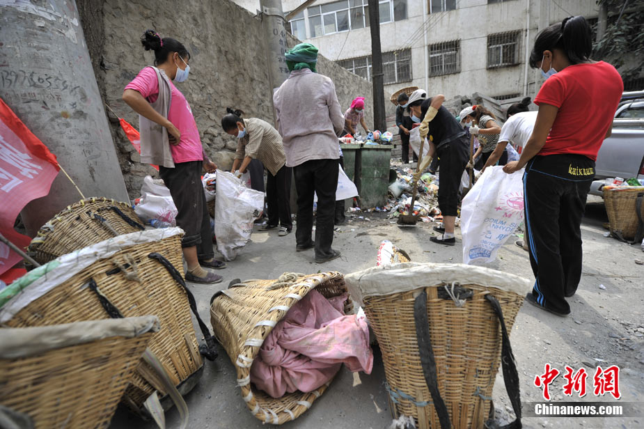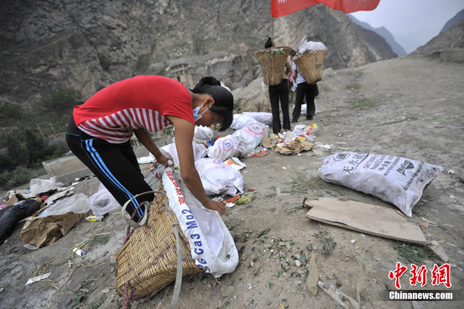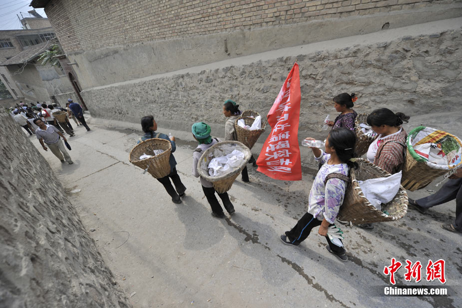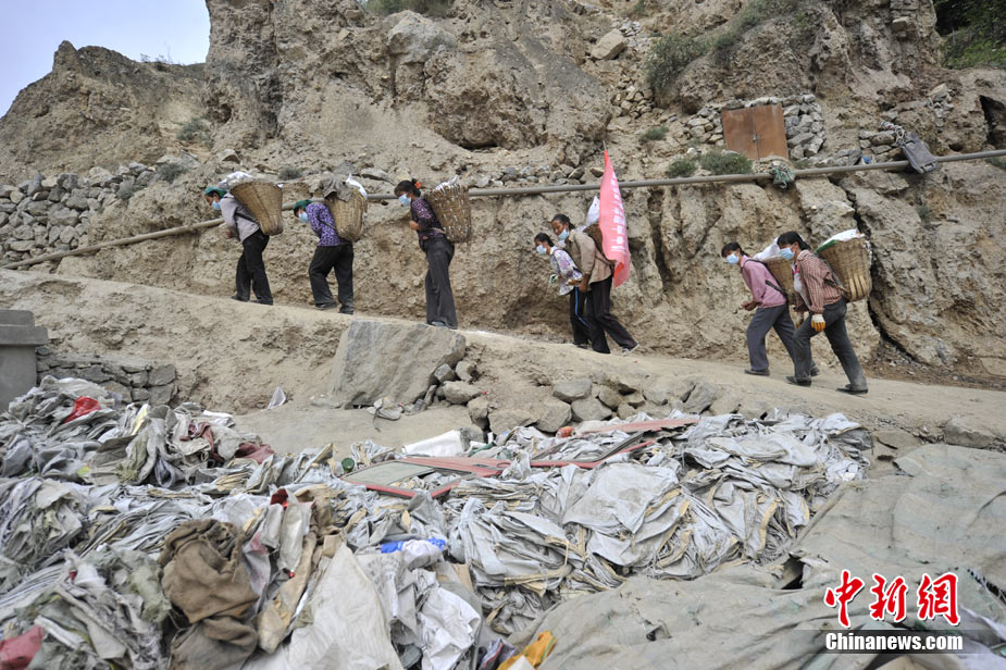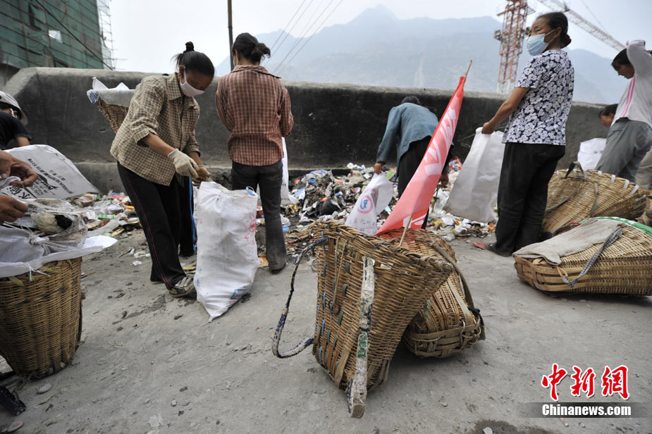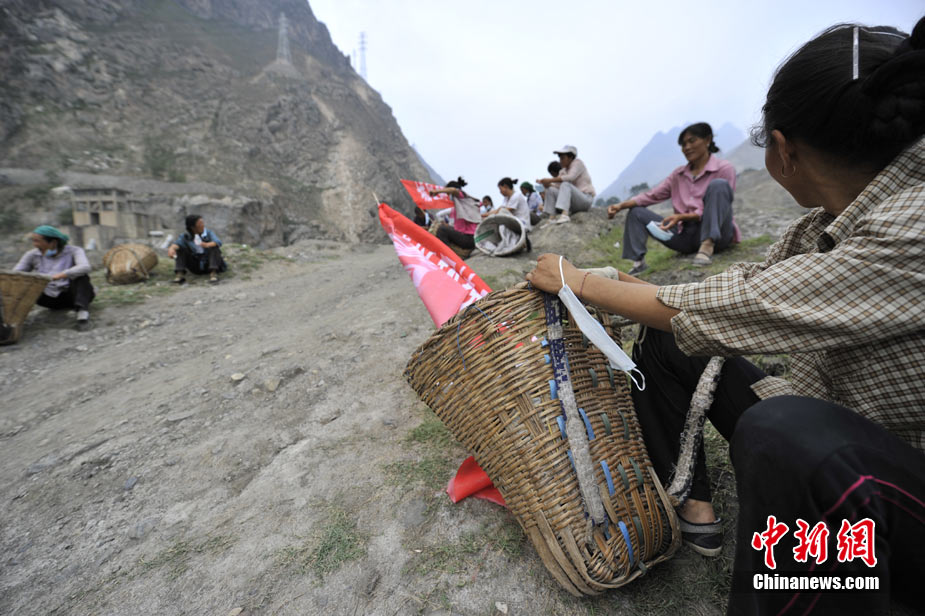 清晨8時(shí)許,舟曲鎖兒頭村的王旻桂和姐妹們來(lái)到城區(qū)。今天,她們的任務(wù)是將城區(qū)的生活垃圾清運(yùn)出去。這是一支“背簍突擊隊(duì)”——“城區(qū)環(huán)境衛(wèi)生清理突擊隊(duì)”的旗幟在王旻桂的背簍上飄揚(yáng)!氨澈t”這種當(dāng)?shù)卮迕裼脕?lái)搬運(yùn)物品的日常工具,在救災(zāi)任務(wù)繁忙、交通不暢時(shí),成為“利器”。