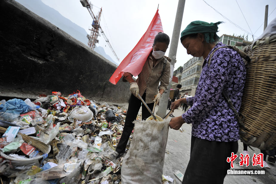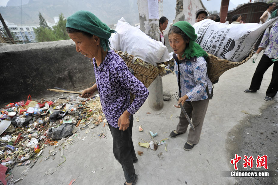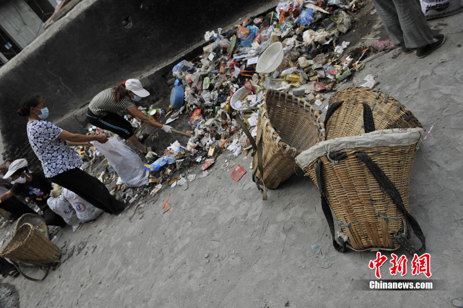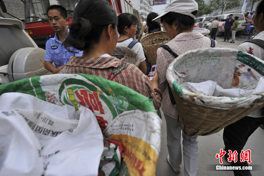 8點(diǎn)多,王旻桂和姐妹們裝起第一背簍垃圾,高高低低、曲曲折折、穿街走巷。城區(qū)中身著各種專(zhuān)業(yè)服裝、攜帶各種專(zhuān)業(yè)設(shè)備的救援隊(duì)來(lái)來(lái)往往。而這支“低調(diào)”的“突擊隊(duì)”還是引人側(cè)目。
