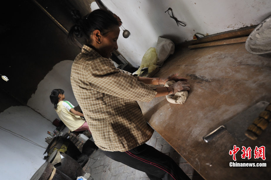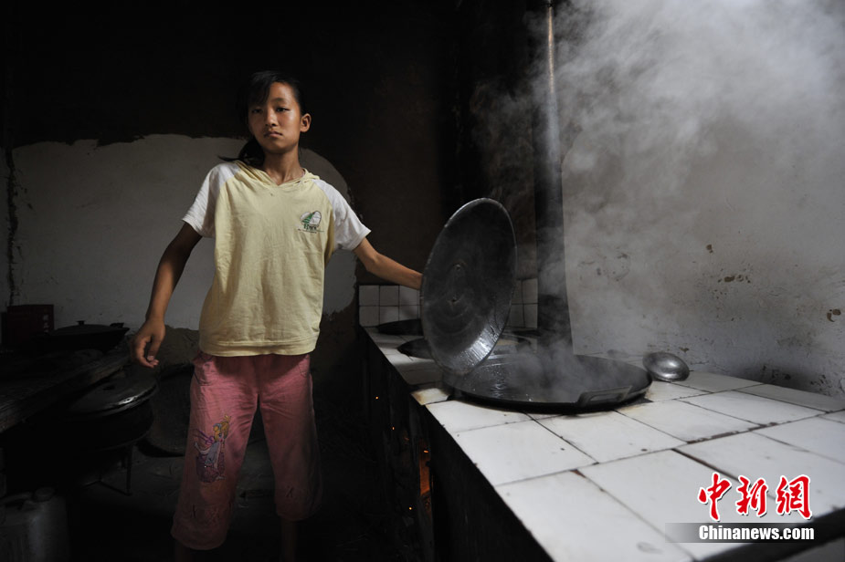 王旻桂的丈夫,因?yàn)樵缟先兔葹?zāi)弄傷了腿,她到家時(shí)飯還沒(méi)做。洗洗手后,王旻桂立即招呼兩個(gè)孩子開(kāi)始準(zhǔn)備午飯,生火、揉面……,不一會(huì),西北特色的湯面片就已經(jīng)上桌。