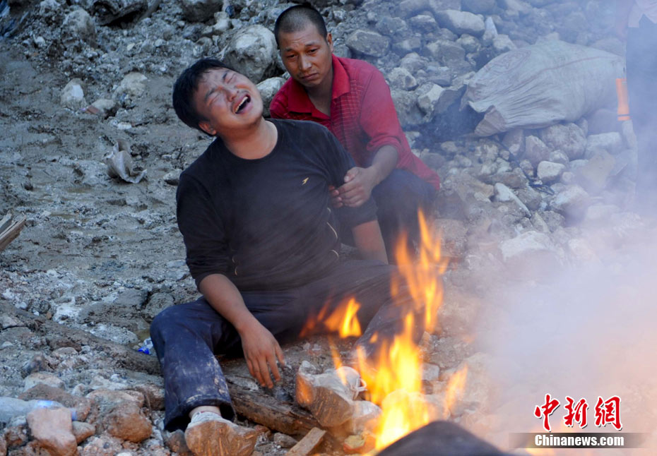8月12日,甘肅舟曲泥石流災(zāi)區(qū),一名男子在焚燒親人遺物的火堆旁抽泣,他的父母、妹妹、女兒在此處的廢墟中一直未能找到。中新社發(fā) 廖攀 攝