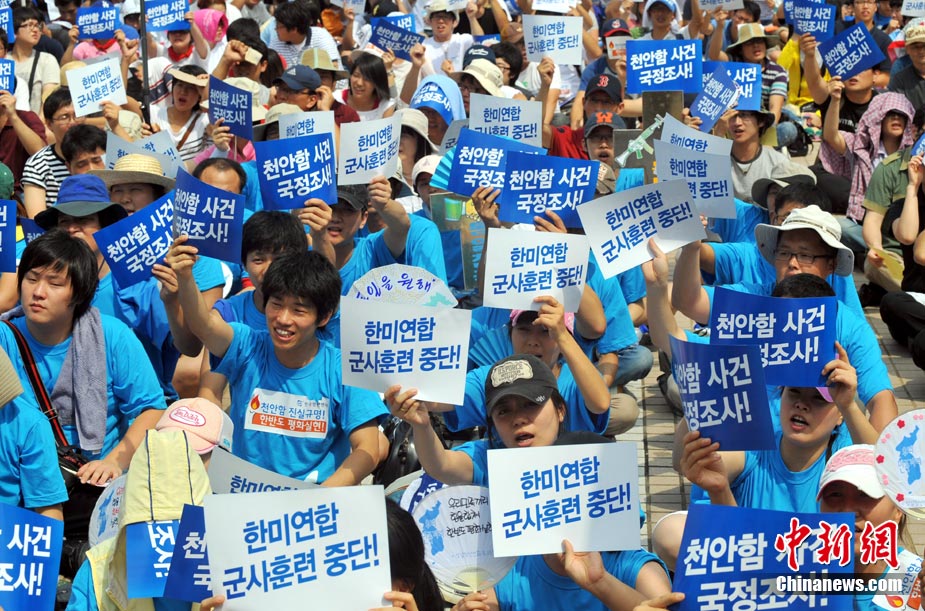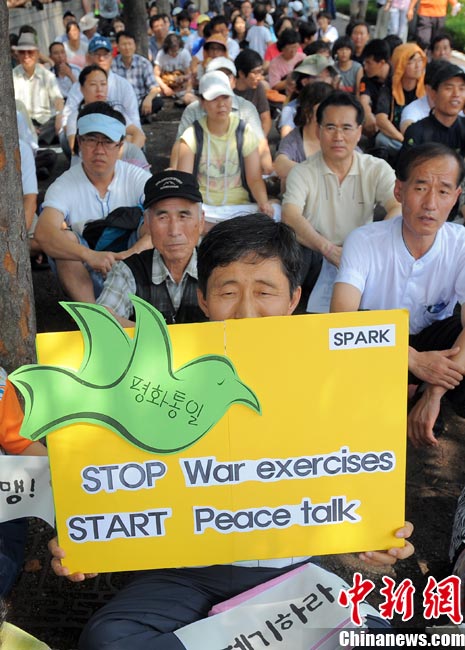 8月15日,在韓國(guó)首都首爾,韓國(guó)民眾在戰(zhàn)爭(zhēng)紀(jì)念館前集會(huì),反對(duì)韓國(guó)與美國(guó)舉行代號(hào)為“乙支自由衛(wèi)士”的聯(lián)合軍演。