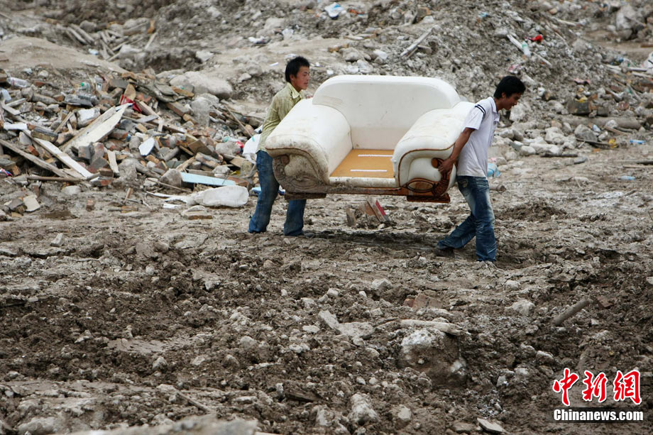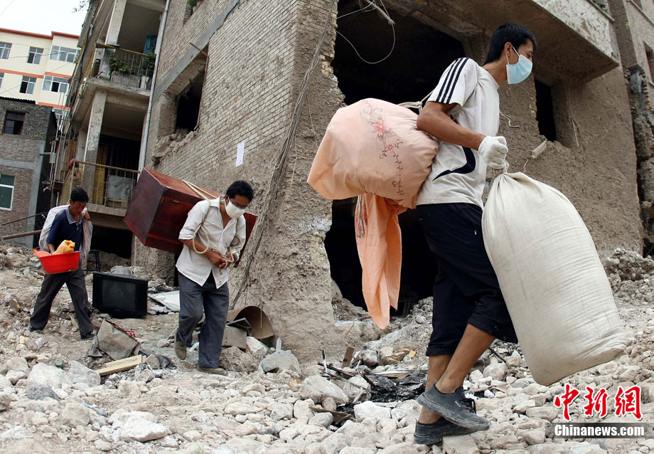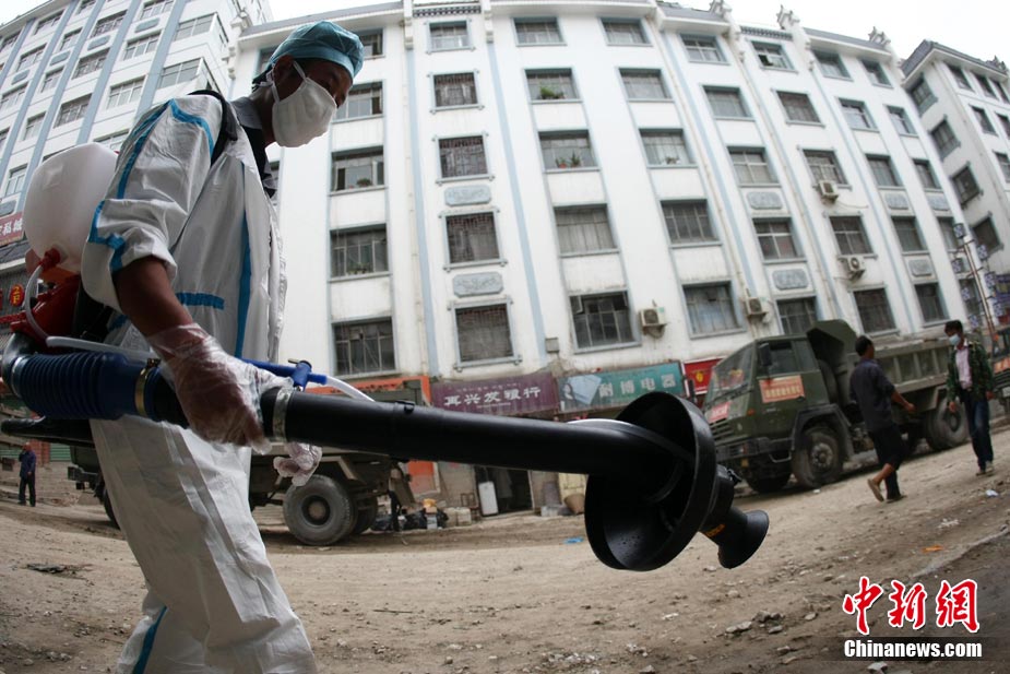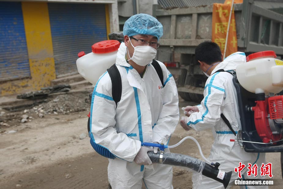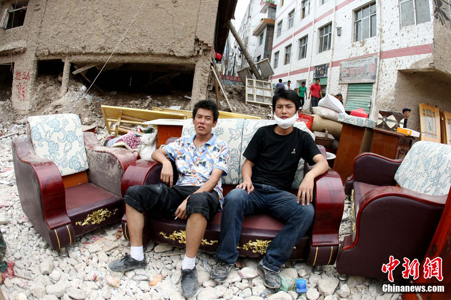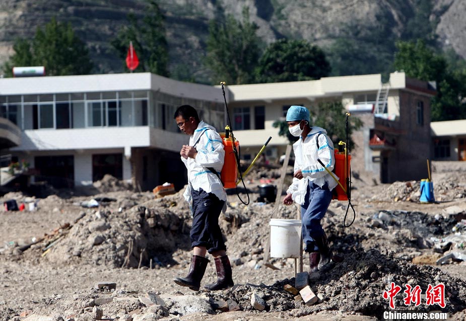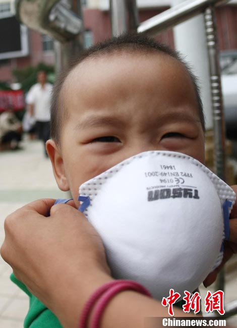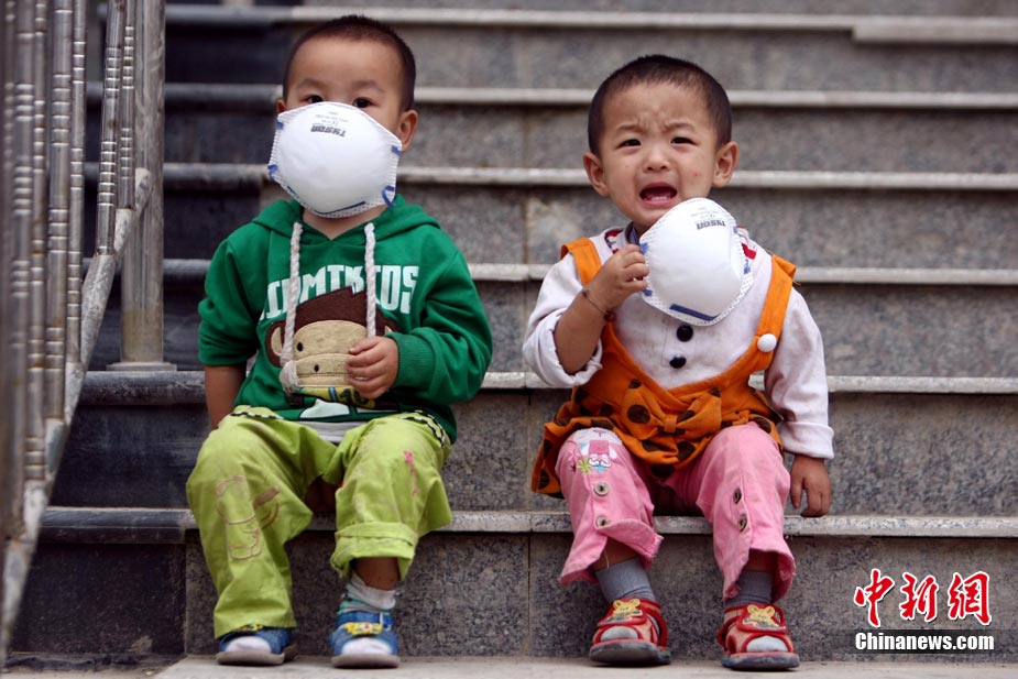 8月16日,甘肅舟曲泥石流災(zāi)區(qū),一歲大的女孩楊歡(左)、樂樂坐在臺(tái)階上,戴著大大口罩等待家人,楊歡的媽媽在這次特大泥石流災(zāi)害中不幸遇難。目前,舟曲災(zāi)區(qū)衛(wèi)生防疫工作在不斷加強(qiáng),防疫人員每天至少對(duì)安置點(diǎn)進(jìn)行1次全面消毒、殺蟲。對(duì)于食堂、垃圾場(chǎng)等重點(diǎn)部位每天至少消毒殺菌3次以上。 中新社發(fā) 杜洋 攝