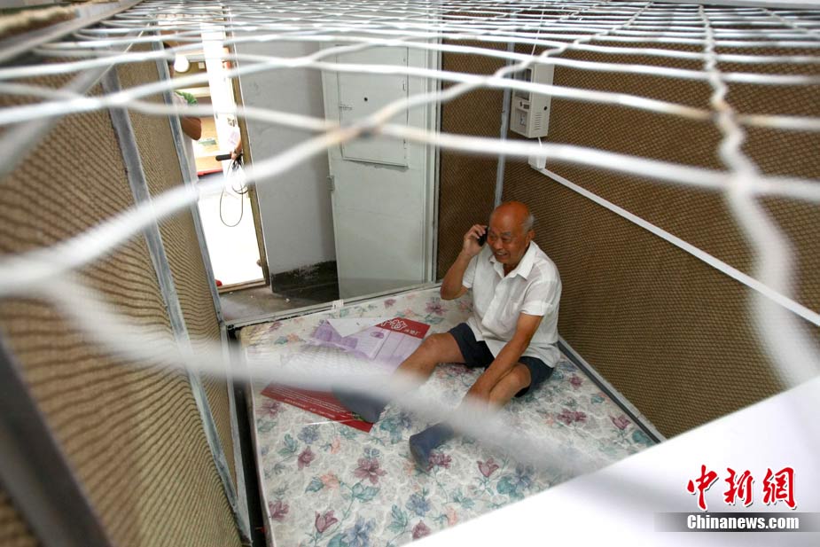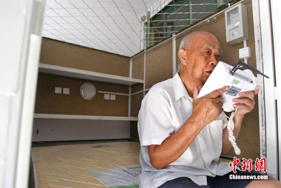 8月16日,在北京石景山區(qū)麻峪東街,78歲老人黃日新所建的第三代膠囊公寓開張。第三代膠囊公寓設(shè)有單人間和夫妻間(圖),大小為長2.4米、寬1.2米(夫妻房寬1.6米)、高2米。每個(gè)膠囊房間采用席夢思床墊,在電腦桌上方安置床頭柜,安裝獨(dú)立電表,并增設(shè)廚房和廁所。中新社發(fā) 富田 攝