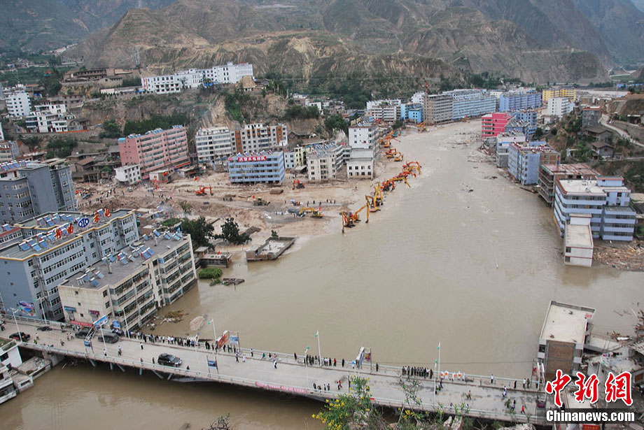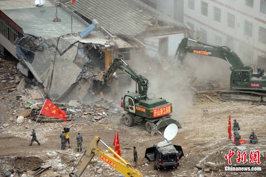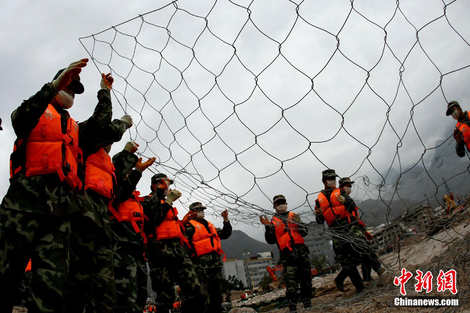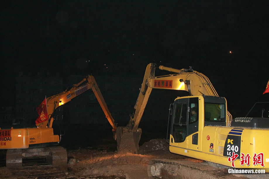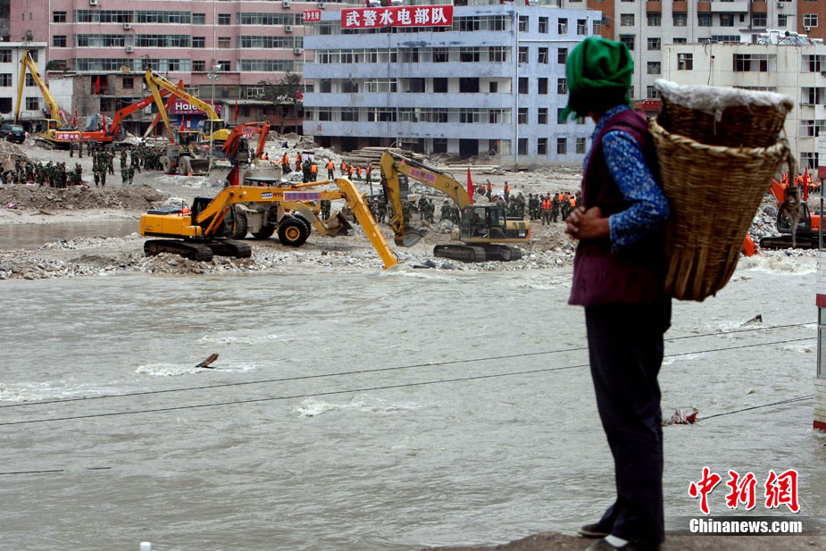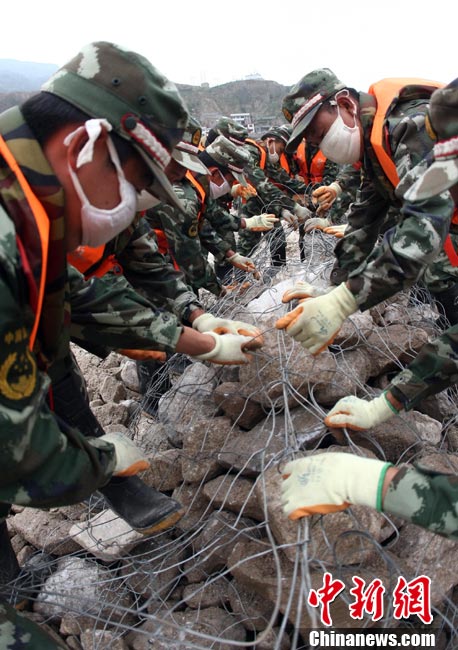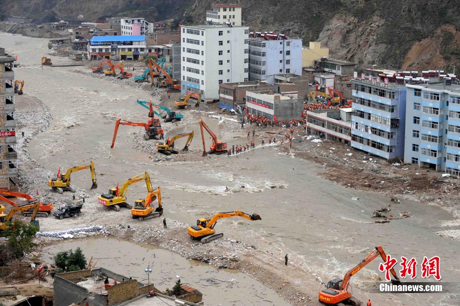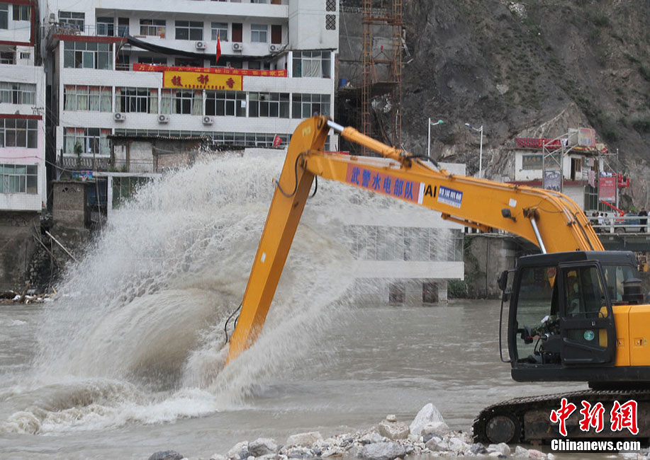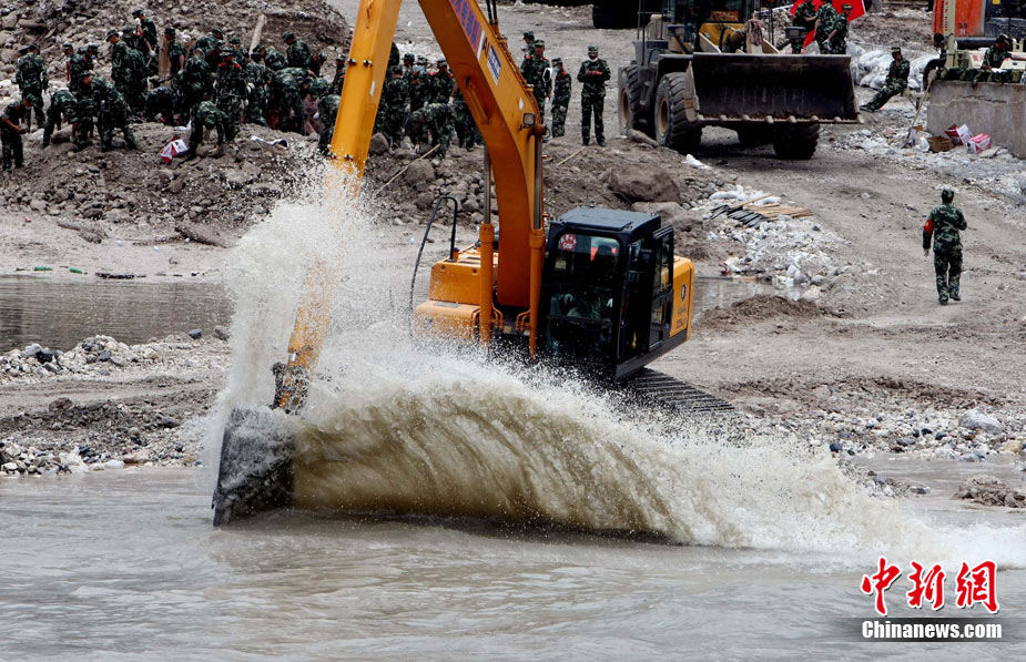 連日來,舟曲搶險救災部隊在三眼峪左岸通過鉛絲籠、石塊固基護腳,爭取盡早開展城江橋下堰塞體清淤疏通作業(yè)。中國水利部部長陳雷表示,舟曲白龍江堰塞體的處置難度已經(jīng)超過了汶川大地震時的唐家山堰塞湖。目前,三眼峪以下河段泄流河道已基本形成。根據(jù)武警水電第三總隊制定的目標,8月26日,白龍江中斷面控制水位要降至1303.38米,水位累計下降5.5米。圖為8月18日,武警水電第三總隊在舟曲挖掘堰塞體。中新社記者 殷春永 攝