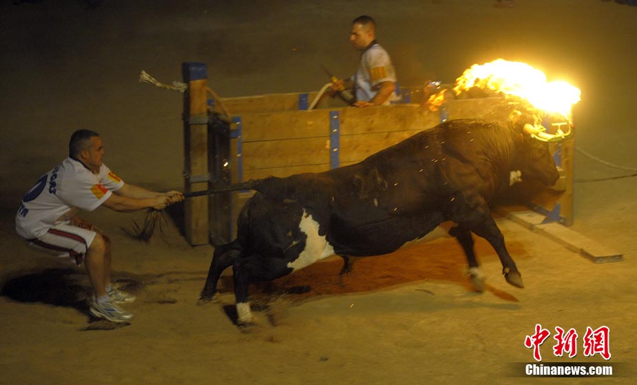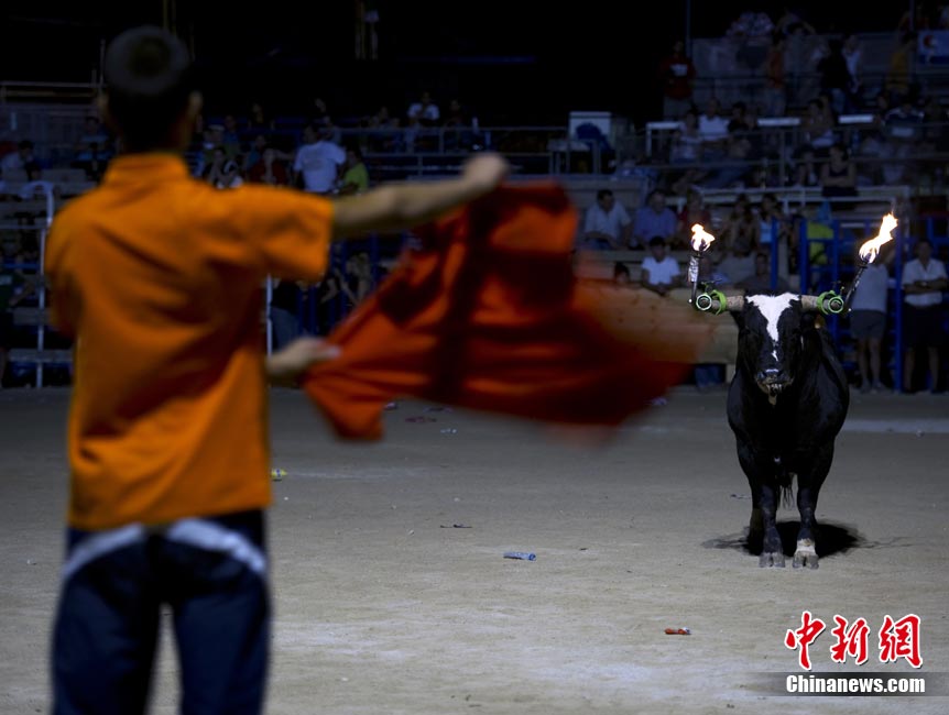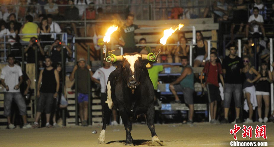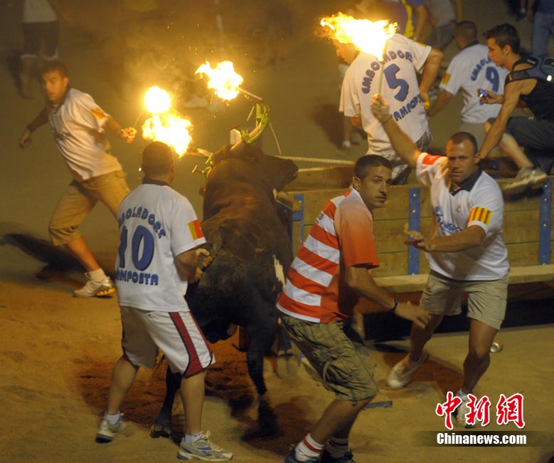 近日,在西班牙安波斯塔市,舉行“奔火!被顒(dòng)。“奔火!笔俏靼嘌罇|部地區(qū)的傳統(tǒng)節(jié)日慶典活動(dòng)。在活動(dòng)中,公牛的犄角被綁上火把滿(mǎn)場(chǎng)飛奔,場(chǎng)面驚險(xiǎn)刺激。