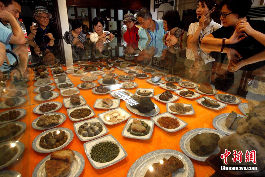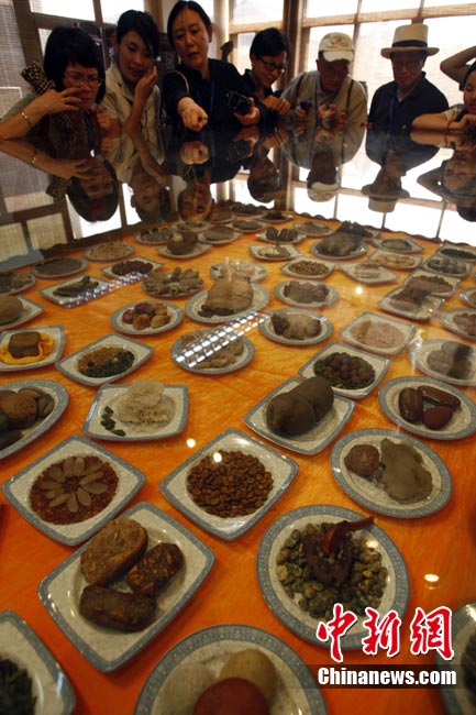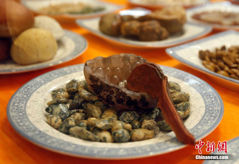 8月20日,游客在廣西柳州八桂奇石館欣賞“滿(mǎn)漢全席”。這些栩栩如生的各式奇石酷似美食佳肴,令游客垂涎欲滴。中新社記者 張宇 攝