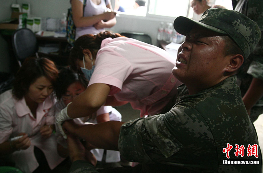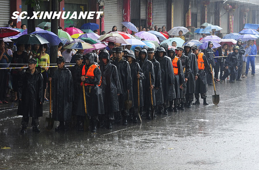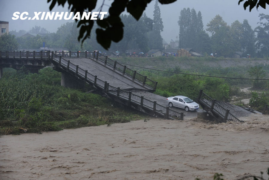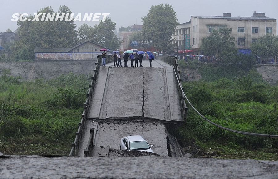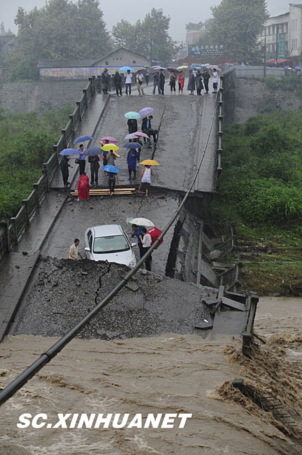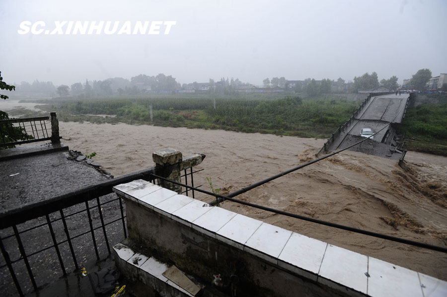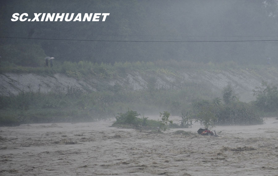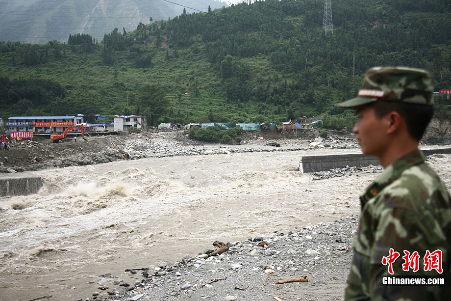 8月19日晚10時(shí)許,洪峰再次通過(guò)汶川縣映秀鎮(zhèn),突如其來(lái)的洪峰沖垮了映秀鎮(zhèn)堰塞體旁的防護(hù)欄,造成該段岷江水位下降,湍急的水流轉(zhuǎn)向沖刷映秀鎮(zhèn)新城河堤,搶險(xiǎn)隊(duì)已用裝有石料的鐵絲網(wǎng)圍住河堤以保護(hù)映秀鎮(zhèn)新城。圖為已沖毀的岷江防護(hù)欄。中新社發(fā) 張浪 攝