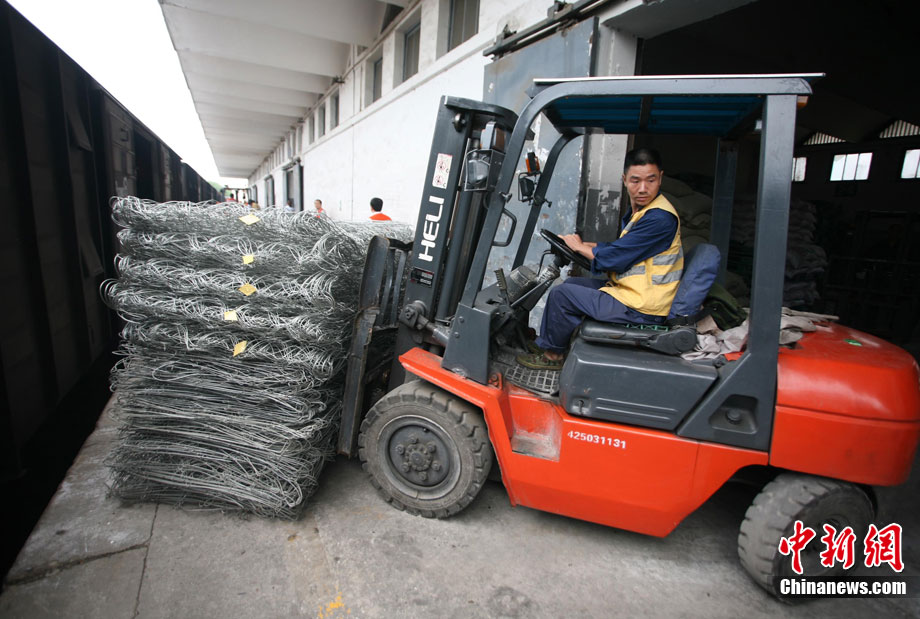 8月21日上午,國(guó)家防總緊急調(diào)撥的80艘沖鋒舟,40支橡皮舟、120臺(tái)船外機(jī)、1萬(wàn)件救生衣、4000片鉛絲籠網(wǎng)片、4000個(gè)鋼絲網(wǎng)兜、500盞查險(xiǎn)燈等搶險(xiǎn)救災(zāi)物資順利抵達(dá)成都火車東站,將立刻分發(fā)運(yùn)往成都、眉山、樂(lè)山、巴中等災(zāi)情嚴(yán)重地區(qū)。圖為裝卸工人正在吊裝沖鋒舟。中新社發(fā) 劉忠俊 攝