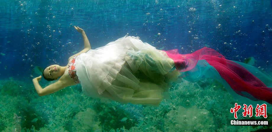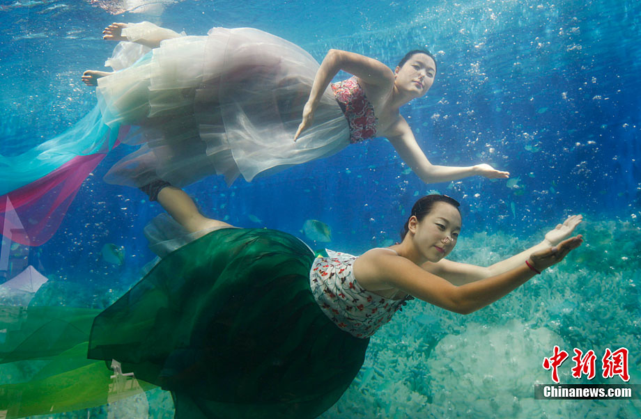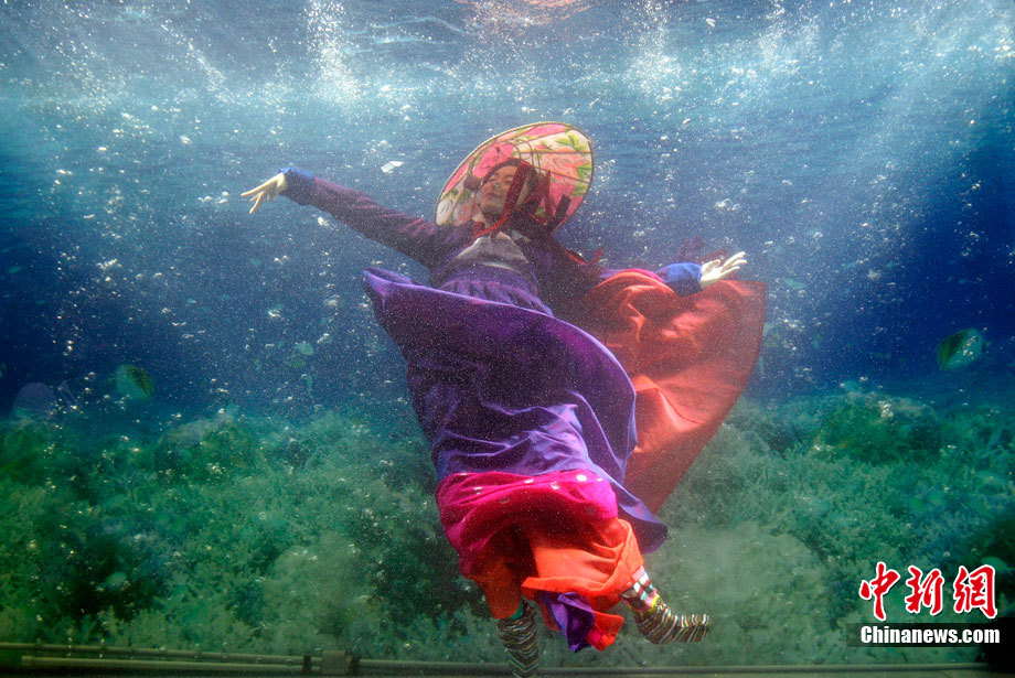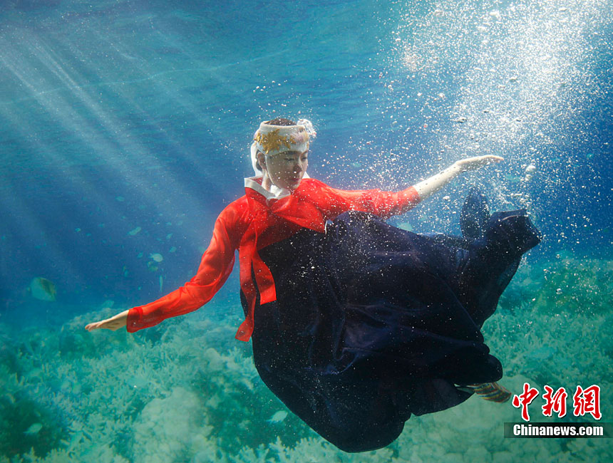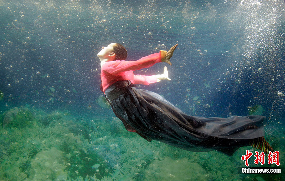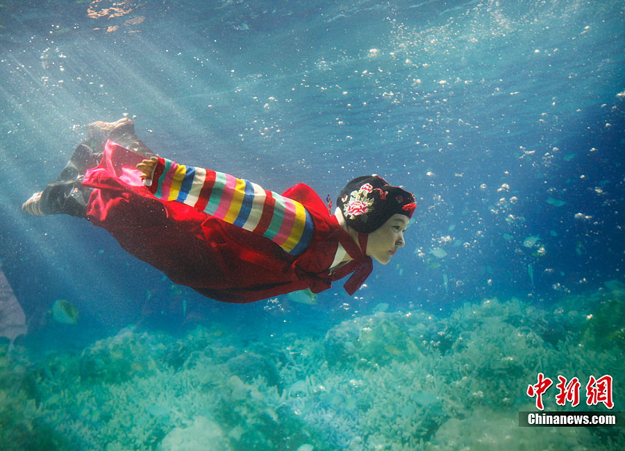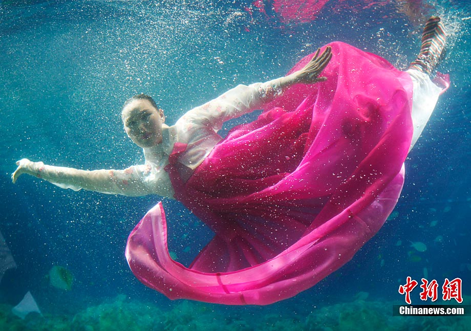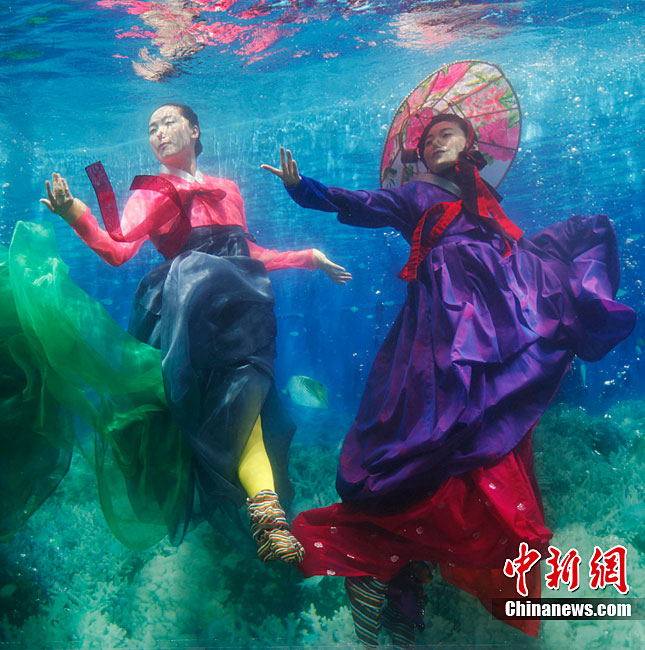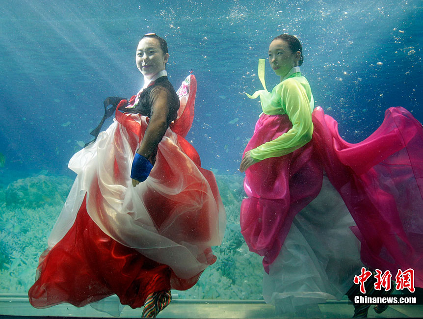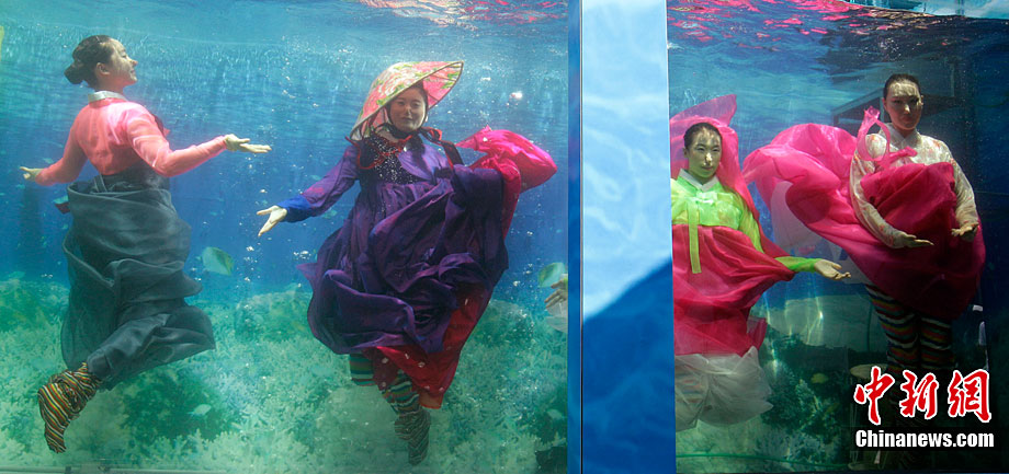 當(dāng)?shù)貢r(shí)間8月22日,在韓國(guó)首都首爾舉辦的一場(chǎng)名為“水下韓服秀”的推廣活動(dòng)中,多名身著韓服的潛水員在水族箱中為觀眾表演。