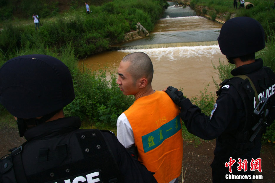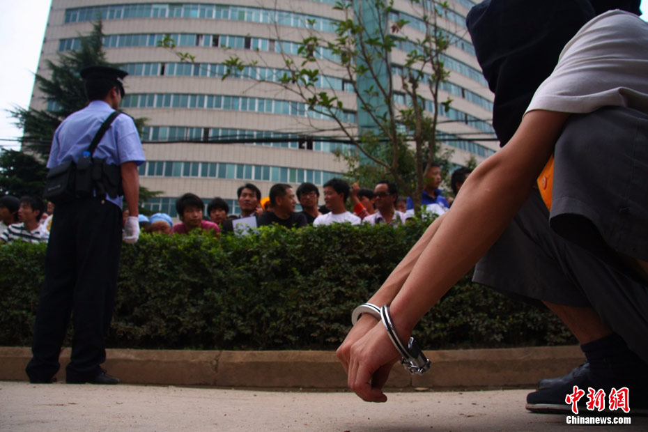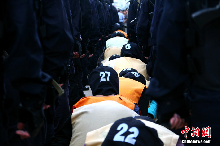 8月23日,昆明警方押解“洪興幫”黑惡勢(shì)力團(tuán)伙21名主要犯罪嫌疑人指認(rèn)現(xiàn)場(chǎng)。昆明警方連日來(lái)積極開(kāi)展“嚴(yán)打整治行動(dòng)”,于2010年5月成功搗毀長(zhǎng)期在尋甸縣作惡的“洪興幫”黑惡勢(shì)力團(tuán)伙,繳獲作案大型砍刀30余把,軍用子彈58發(fā),防刺服2件以及20余部通訊設(shè)備。中新社發(fā) 任東 攝