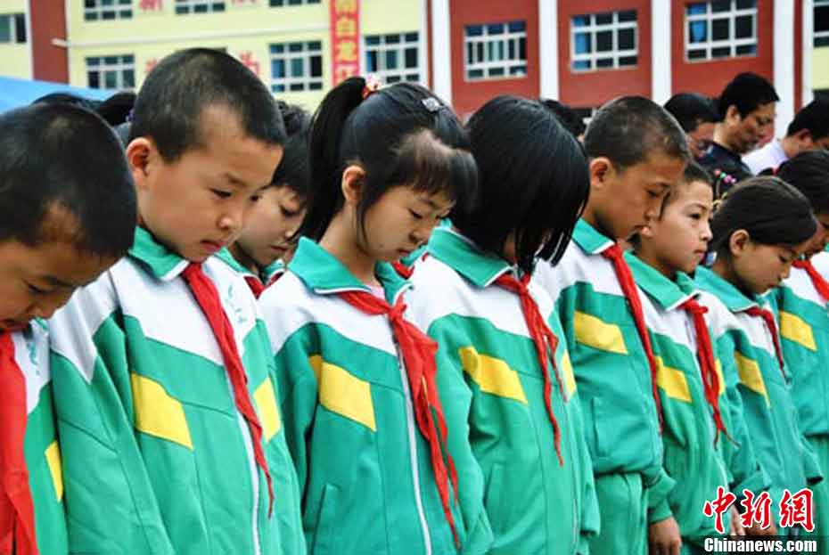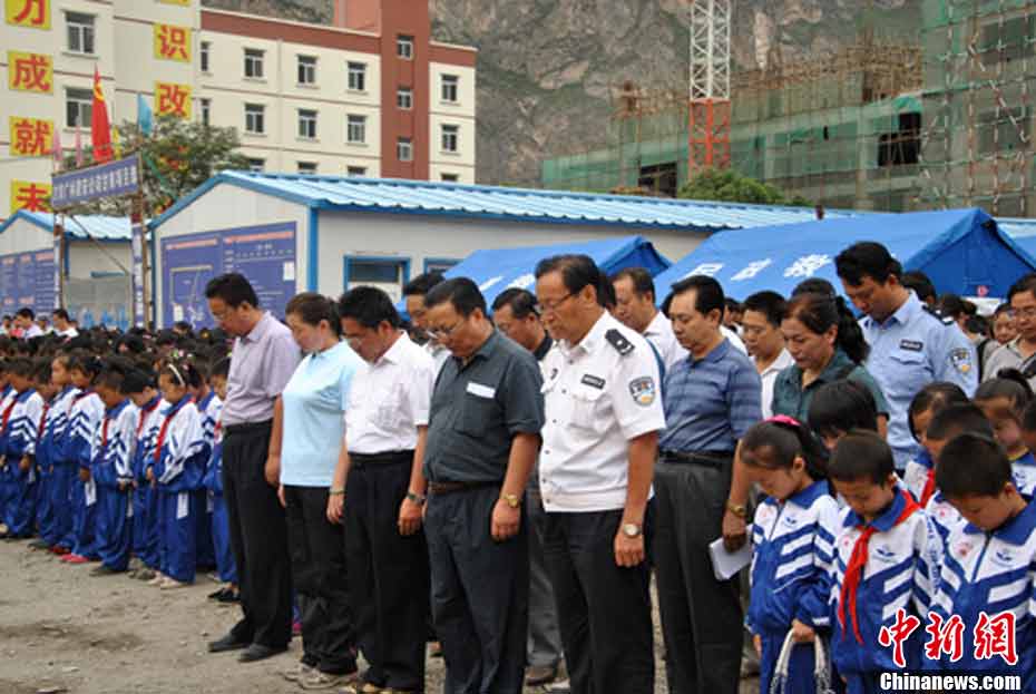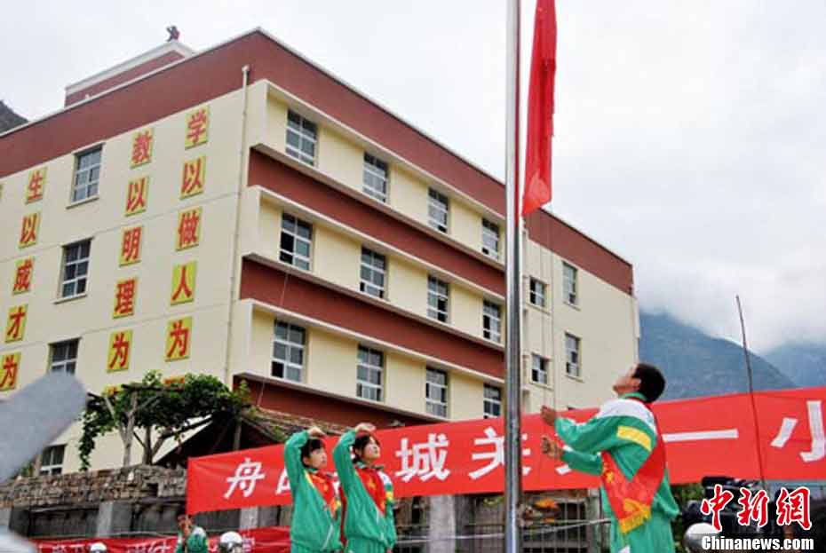 8月25日,舟曲小學生迎來新學期的第一天。圖為當日上午城關(guān)一小舉行升國旗儀式。馬曉俊 攝