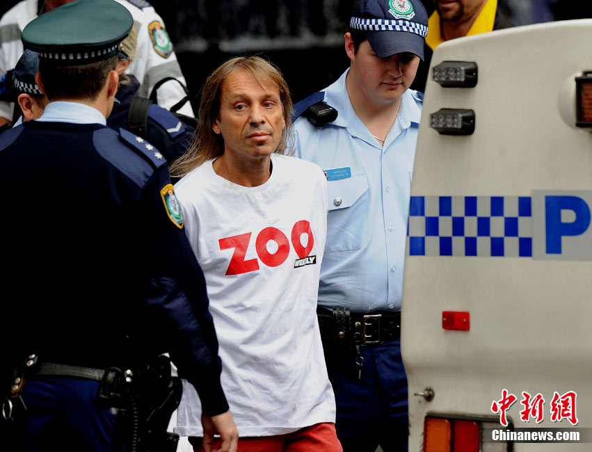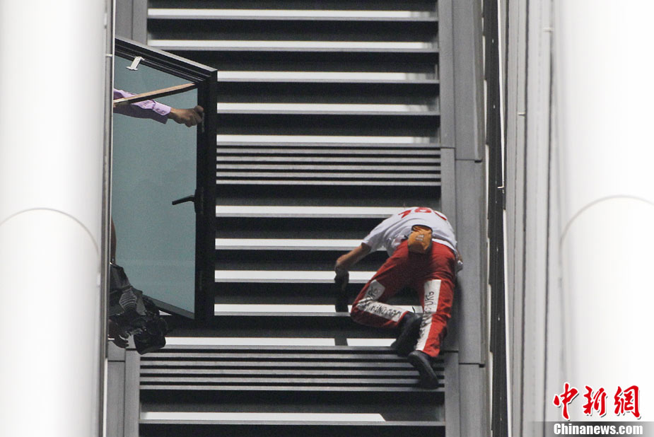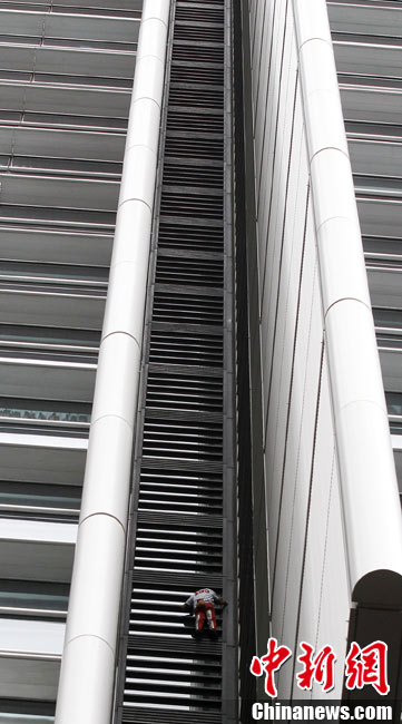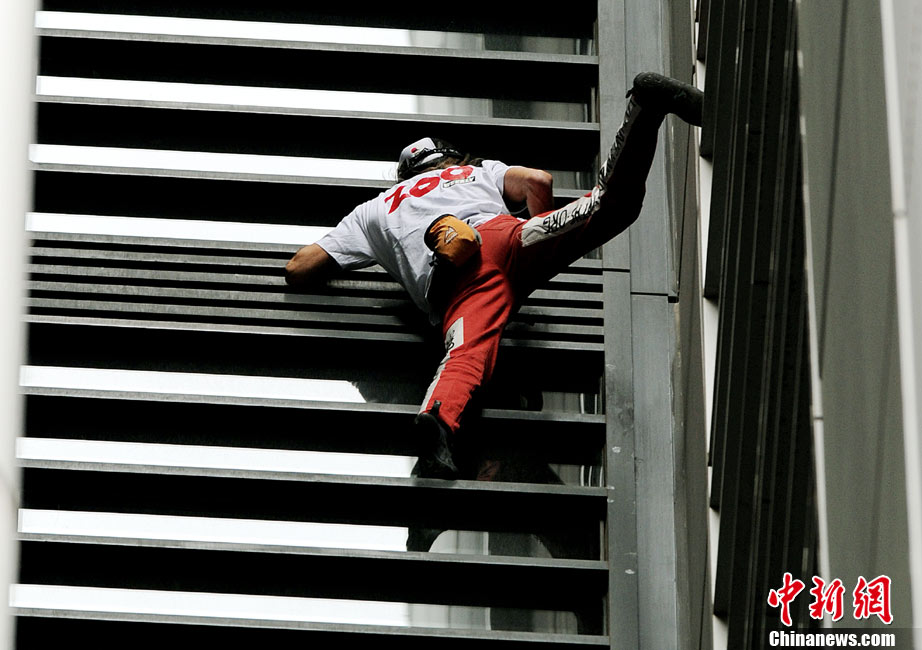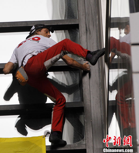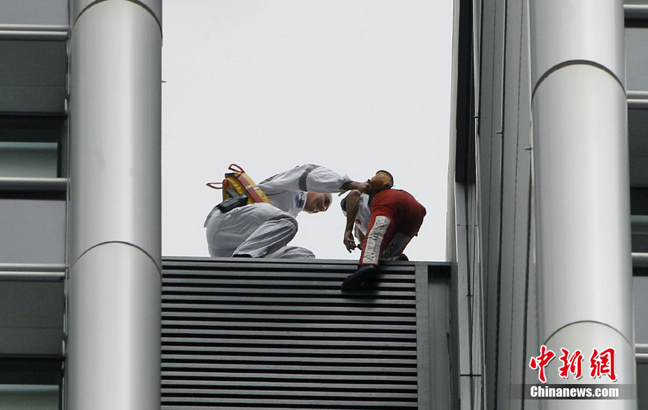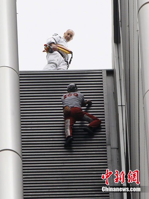 8月30日,悉尼,現(xiàn)年48歲的法國“蜘蛛俠”阿蘭·羅伯特攀爬悉尼最高住宅大樓57層高的Lumiere大樓。當羅伯特爬上大樓樓頂,便遭到警方逮捕。據(jù)悉,到目前為止,羅伯特已經(jīng)成功地在世界各地爬上了共計70座高層建筑,包括紐約帝國大廈、芝加哥西爾斯大廈(Sears Tower)及馬來西亞吉隆坡的雙子塔等。