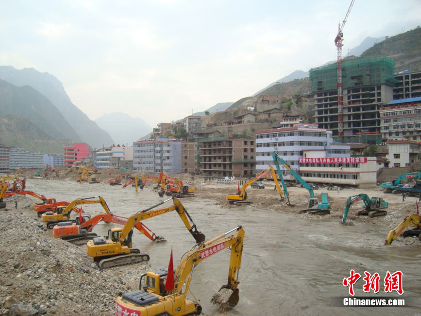 8月30日,舟曲白龍江堰塞湖應(yīng)急排險和河道應(yīng)急疏通任務(wù),比預定時間提前12小時全面完成。這是解放軍副總參謀長章沁生30日15時在舟曲白龍江城江橋頭召開的新聞發(fā)布會上,向社會公布的。章沁生在發(fā)布會上說,到30日12時,城江橋至城關(guān)橋段水位已回落至省道313線最低點,城區(qū)積水全部回流歸槽,標志著舟曲白龍江堰塞湖應(yīng)急排險和河道應(yīng)急疏通任務(wù)全面完成。舟曲特大山洪泥石流災(zāi)害發(fā)生后,導致白龍江形成堰塞湖致使江水水位暴漲,舟曲縣城三分之一街區(qū)被淹。武警水電部隊、蘭州軍區(qū)工程兵某部每天出動上千官兵,大型機械百余臺,先是排除了堰塞湖潰決險情,從13日轉(zhuǎn)入河道應(yīng)急疏通任務(wù),24小時持續(xù)奮戰(zhàn),終于提前完成了這一艱巨任務(wù)。圖為在舟曲縣城江橋上游河段,解放軍和武警部隊晝夜不停對河道進行除險清淤。 中新社發(fā) 郭海勇 攝